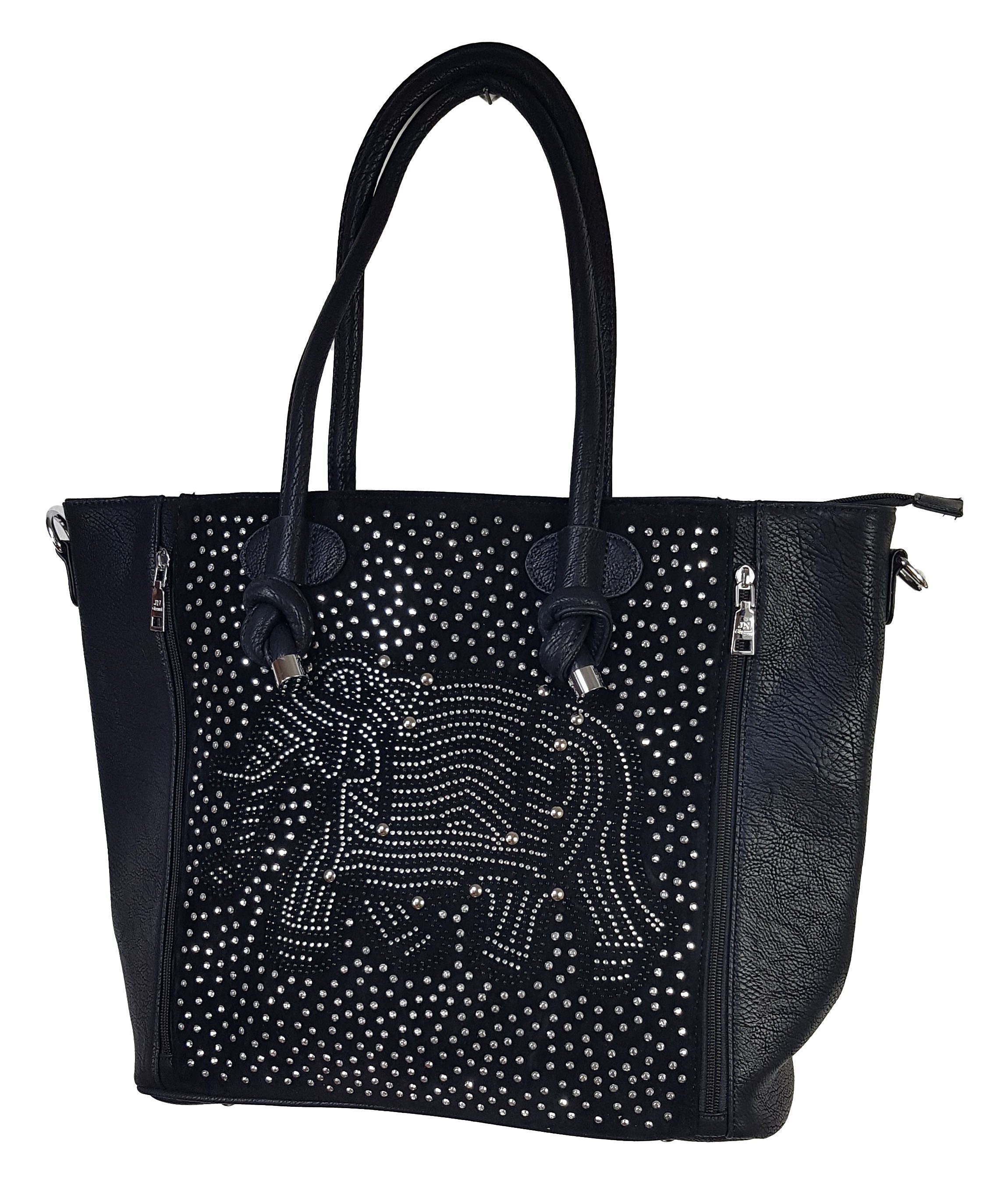 Eine phantastisch praktische und schöne Handtasche aus schwarzem Kunstleder, perfekt für alle Elefanten-Sammler und Tierfreunde allgemein. Die Tasche ist bestückt mit vielen silbernen geschliffenen Nieten, die im Licht geheimnisvoll schimmern. Der Elefant besteht aus hunderten kleinen geschliffenen Strasssteinen. Die Innenausstattung besteht aus festem Stoff und ist sehr aufwändig gestaltet. 2 verschiedene Abteilungen, in der Mitte ein Fach mit Reißverschluss und viele Seitenfächer bieten die Möglichkeit, die Tasche super ordentlich einzurichten. Die Размер der Tasche beträgt 48x36 cm. Dazu erhalten Sie einen langen verstellbaren Umhängeriemen. Diese Tasche ist ein Musthave und richtig elefantös....