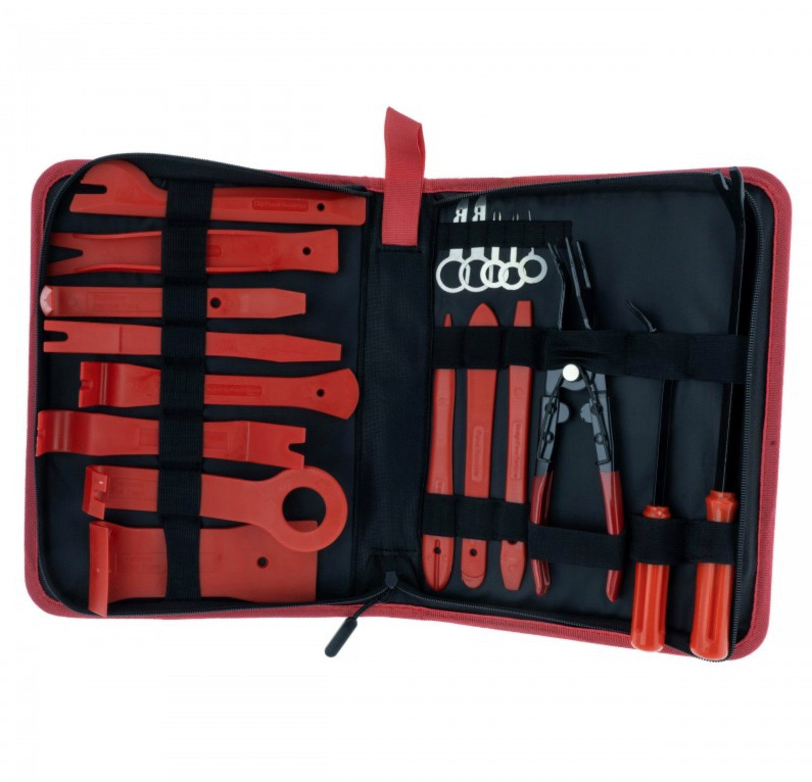 Lieferumfang | 9x Kunststoffhebel in verschiedenen Formen 2x Keile für Leisten und Lackschutz 3x Spezialwerkzeuge (Spachtel, Schwertform etc.) 2x Radiohaken 3x Schlüssel für Pins 1x Clipzange 2x Clipentferner (kurz/lang) 4x doppelseitige Spezialhebel 1x Etui |