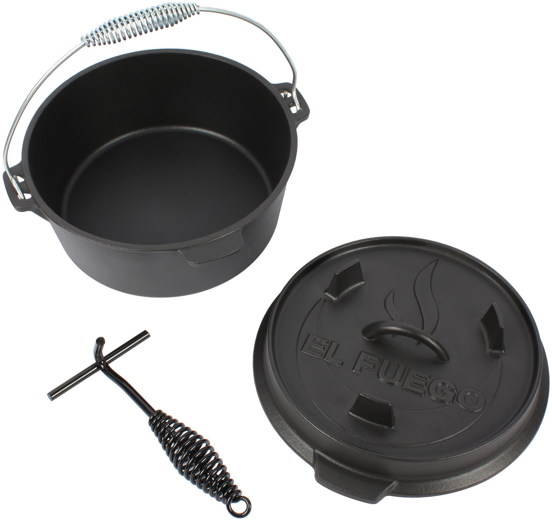 Kochen auf die klassische Art! Mit diesem „Dutch oven“ in äußerst robuster Ausführung aus 100 % massivem Gusseisen können Sie auf traditionelle Weise verschiedenste Speisen zubereiten – Geschmack „wie früher“ inklusive! Die Ausführung aus Gusseisen sorgt dafür, dass der Dutch oven die Wärme der Kochstelle sehr gut speichern und über lange Zeit an das Gargut abgeben kann. Dadurch kann auch mit niedrigerer Hitze oder weniger Brennstoff das gleiche Ergebnis erzielt werden. Die Stärke des Materials reduziert dabei erheblich die Gefahr des Anhaftens oder Anbrennens von Speisen. Der Deckel verfügt über eine erhöhte Randlippe und erlaubt es somit, diesen mit Brennstoff zu füllen, um auch mit Oberhitze garen zu können. Zudem verfügt dieser über 3 Standfüße, wodurch der Deckel auch eigenständig genutzt werden kann. Dieser Dutch oven verfügt auch über eine spezielle Oberflächenveredelung ähnlich einer Emaillierung. Diese vereint die Vorteile einer Emaillierung und einer reinen Eisenoberfläche: Hohe Temperaturen sind kein Problem und die Lebensmittelsicherheit bleibt ebenso gewahrt. Enthalten sind auch ein robuster Schürhaken und ein Tragebügel. Innenmaß: ca. Ø 29,7 cm (Topfoberkante) x 12,7 cm Außenmaß: ca. 35,2 x 19 x 33 cm Fassungsvermögen: ca. 7,2 Liter (Topf) + ca. 1,8 Liter (Deckel)
