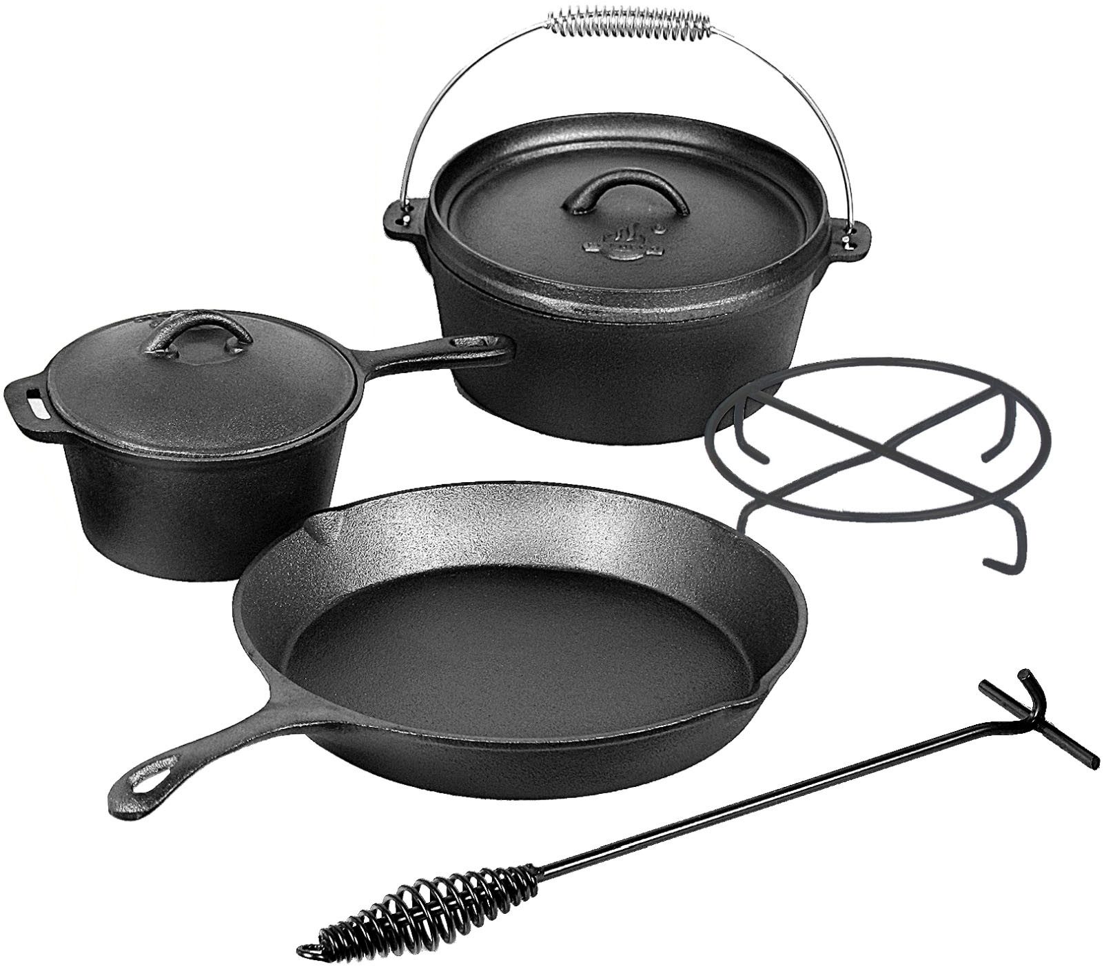 Fünfteiliges Set bestehend aus Dutch Oven mit Deckel, Pfanne, Saucentopf mit Deckel, Untersetzer, Schürhaken/Hebehilfe