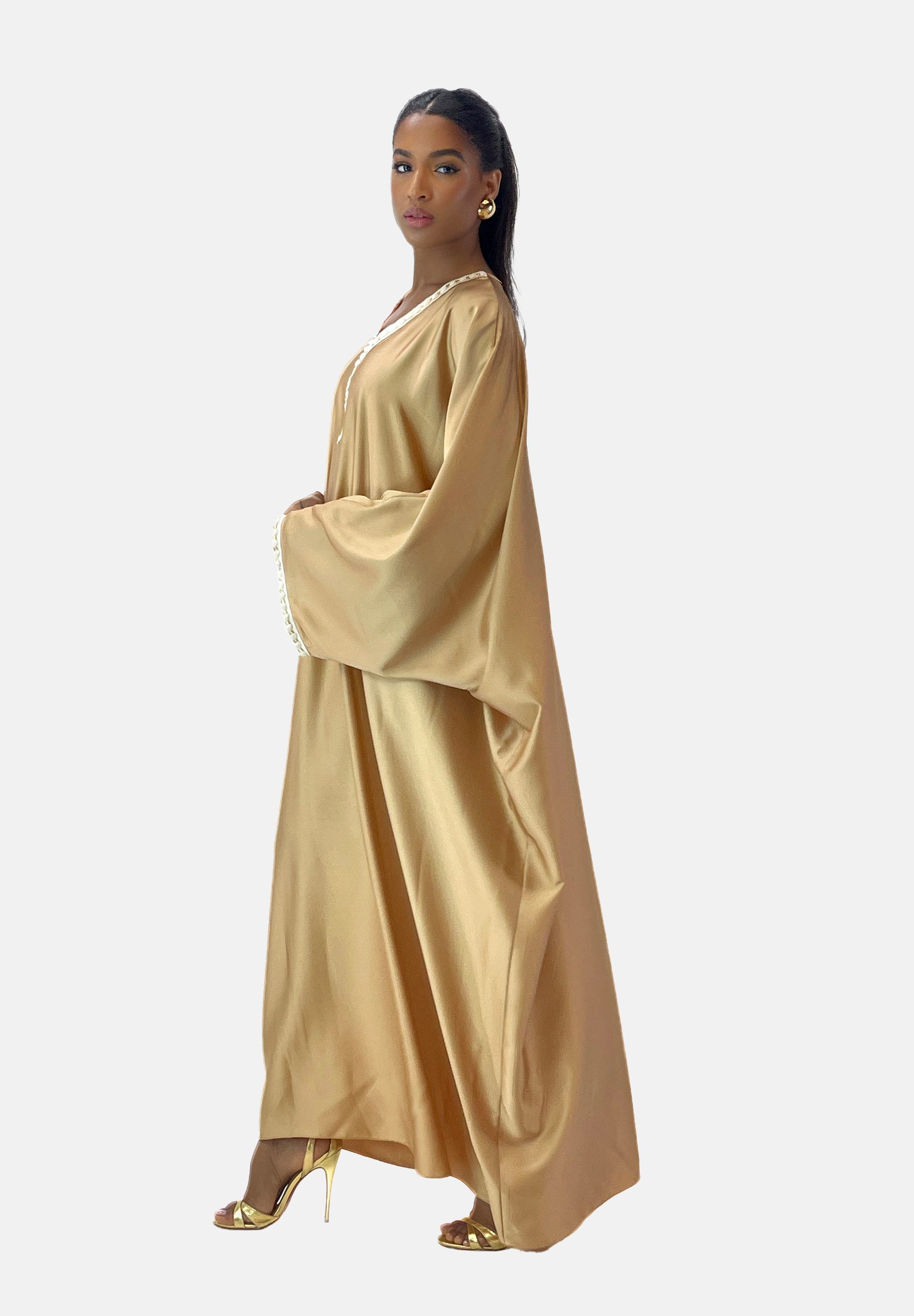 Erleben Sie die zeitlose Eleganz unseres Damen Abaya Maxikleides, meisterhaft gefertigt aus hochwertiger Polyesterfaser. Dieses exquisite Kleid vereint klassischen Charme mit modernem Komfort und bietet Ihnen eine einzigartige Kombination aus Stil und Funktionalität. Majestätisches Design und erhabene Stoffqualität: Unser Abaya Maxikleid besticht durch seine fließenden Linien und das elegante, bodenlange Design, das sowohl Anmut als auch Bescheidenheit ausstrahlt. Der hochwertige Polyesterstoff schmiegt sich sanft an Ihre Haut und sorgt für ein angenehmes Tragegefühl, das den ganzen Tag anhält. Leicht und atmungsaktiv, ist dieses Kleid perfekt für alle Jahreszeiten und Anlässe. Orientalischer Flair für Ihre Garderobe: Mit feinen Details und einem Hauch orientalischer Raffinesse entführt Sie unser Abaya Maxikleid in die zauberhafte Welt von 1001 Nacht. Die kunstvollen Verzierungen und edlen Stickereien spiegeln die reiche Tradition und Kultur des Orients wider, während das schlichte, aber elegante Design moderne Akzente setzt. Vielseitigkeit und Stil: Ob bei festlichen Anlässen, religiösen Zeremonien oder einfach für den täglichen Gebrauch – dieses Maxikleid ist ein wahres Multitalent. Kombinieren Sie es mit dezentem Schmuck und stilvollen Accessoires, um Ihren persönlichen Stil zu unterstreichen und ein Statement zu setzen. Pflegeleicht und langlebig: Dank der strapazierfähigen Polyesterfaser ist unser Abaya Maxikleid nicht nur pflegeleicht, sondern auch langlebig. Es behält seine Form und Farbe auch nach vielen Waschgängen, sodass Sie lange Freude an diesem wunderschönen Kleid haben werden. Fazit: Gönnen Sie sich ein Stück orientalischer Eleganz und zeitloser Schönheit. Unser Damen Abaya Maxikleid aus Polyesterfaser ist die perfekte Wahl für stilbewusste Frauen, die Wert auf Qualität und Design legen. Erleben Sie selbst, wie dieses Kleid Ihre Garderobe bereichert und Ihnen einen Hauch von Luxus verleiht. Verpassen Sie nicht die Gelegenheit, dieses Schmuc