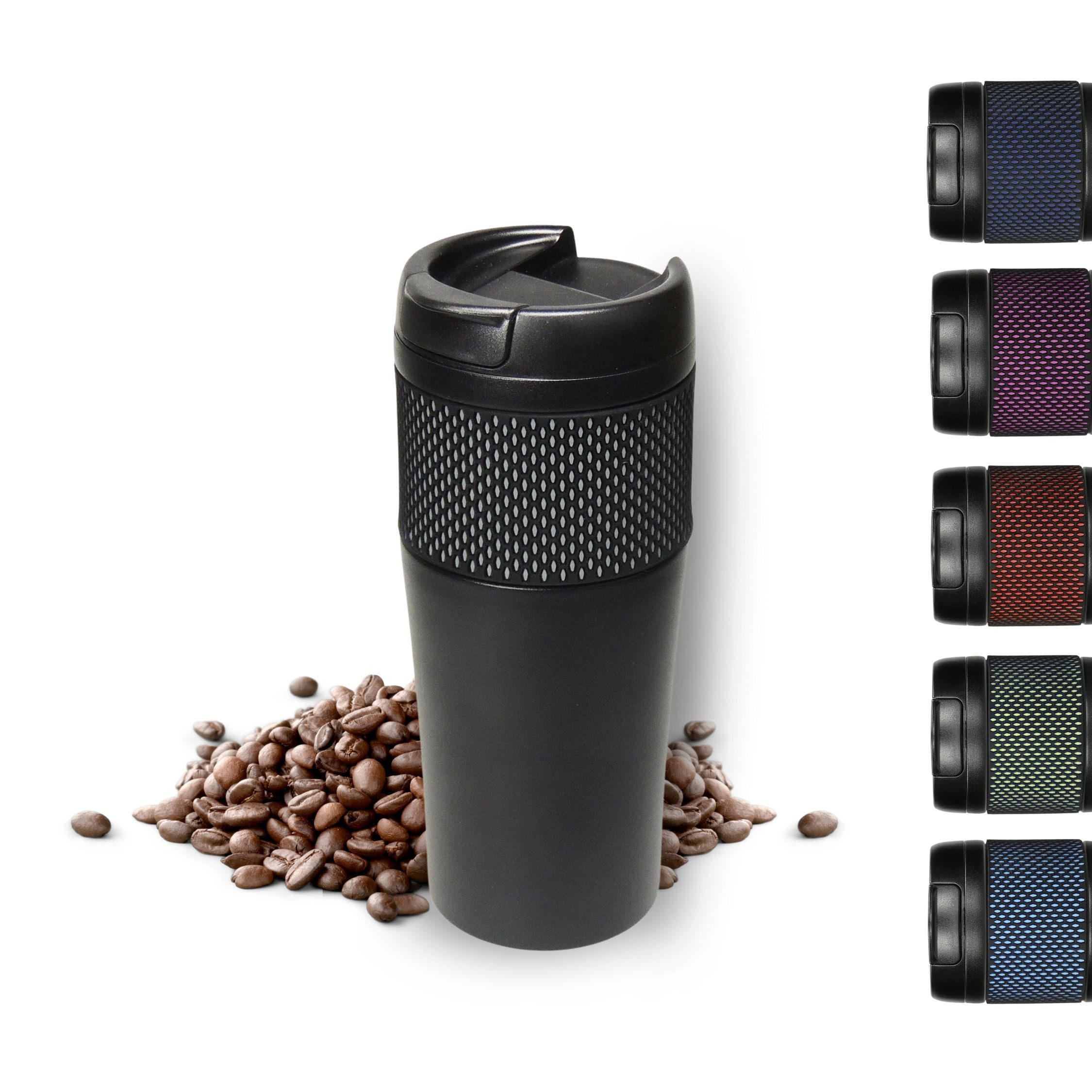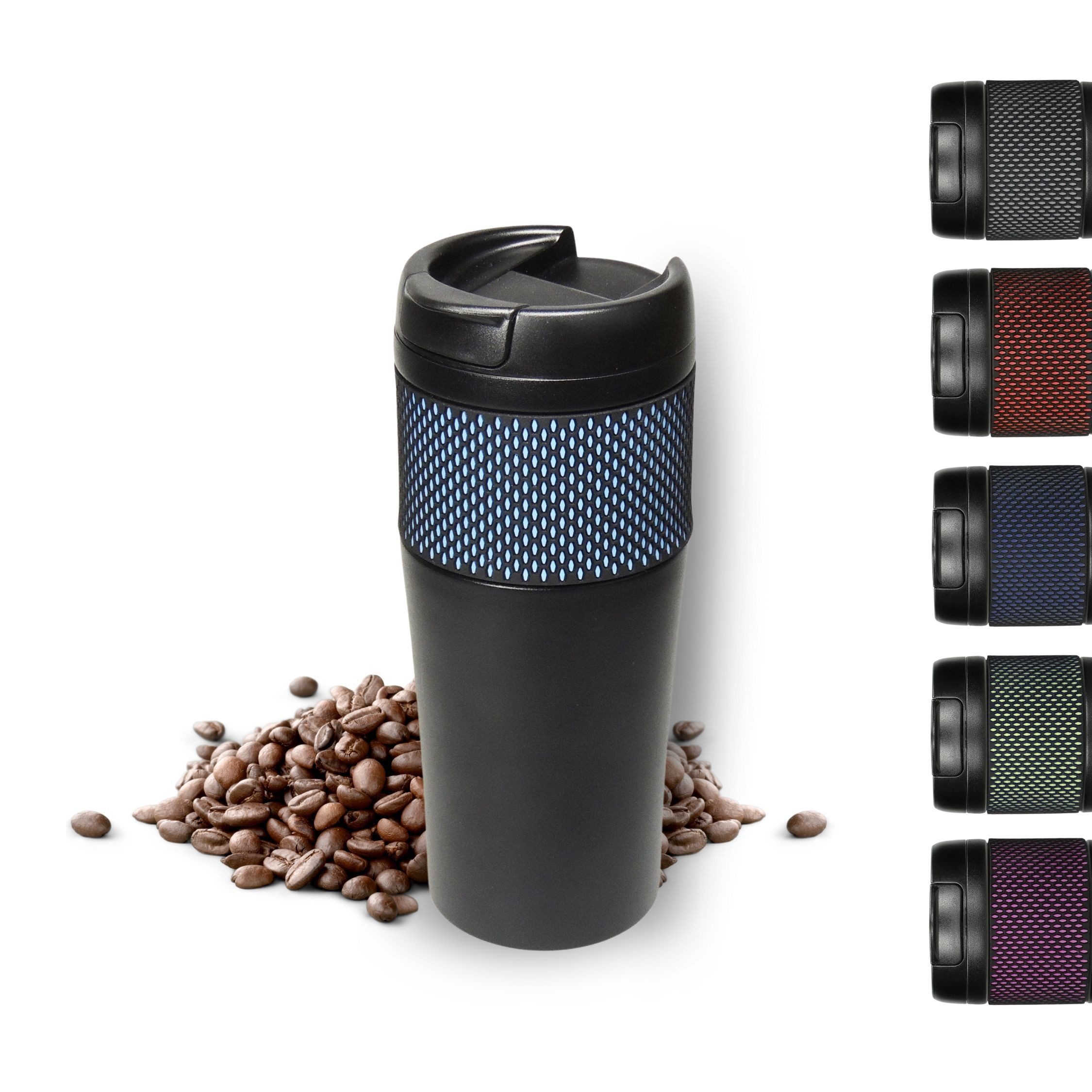Die graue Silikonmanschette bietet nicht nur einen sicheren Griff, sondern verleiht dem Becher auch ein modernes Erscheinungsbild. Mit einer Füllmenge von ca. 0,5 Litern ist dieser Becher perfekt für unterwegs oder den täglichen Gebrauch zu Hause oder im Büro.