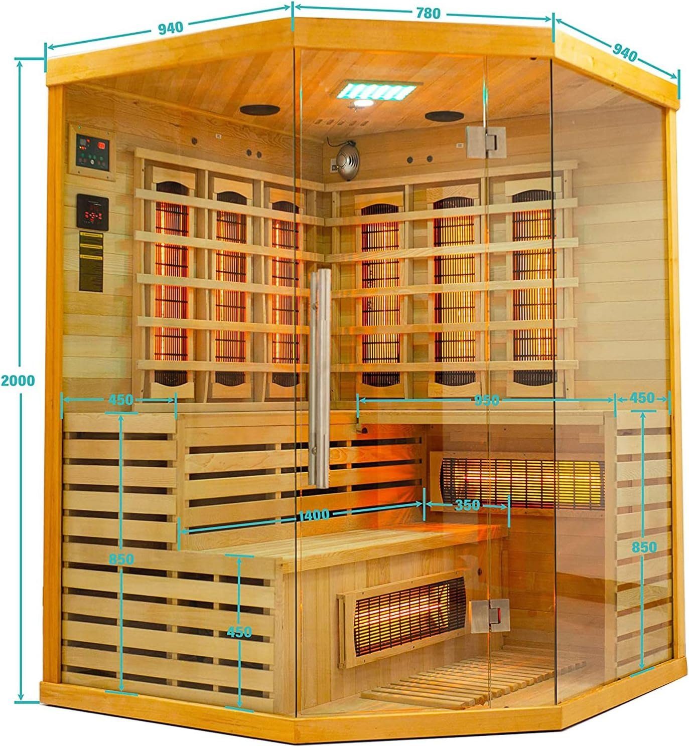 Ionisator mit Ozon-Desinfektion & Aroma-TherapieAnionen-Technologie: Negative Sauerstoffionen aktivieren die Sauerstoffmoleküle in der Luft, wodurch sie aktiver werden und leichter vom Körper aufgenommen werden können. Verbesserung der Lungenfunktion: Nachdem der menschliche Körper sauerstoffhaltige negative Ionen eingeatmet hat, kann die Lunge die Sauerstoffaufnahme um 20% erhöhen. Keimtötende Funktion: Der Anionengenerator erzeugt eine große Anzahl negativer Ionen und gleichzeitig eine Spur von Ozon. Diese Kombination erleichtert die Adsorption verschiedener Viren und Bakterien. | Praktische MusikanlageSie können mit unserer praktischen Musikanlage Musik genießen (USB, Bluetooth, MP3, SD Karte und FM Radio). | Umlaufende 7 farbige LED-BeleuchtungFarbige Umgebungsbeleuchtung für eine bessere Atmosphäre zum gleichen Preis Gönnen Sie sich eine Farblichttherapie mit unserer 7-farbigen LED-Lichterkette, die den Innenraum umgibt. Im Vergleich zum herkömmlichen Farblicht lässt sich unsere 7-farbige Lichterkette besser an Ihre aktuelle Stimmung anpassen. Kann rotes, gelbes, cyanfarbenes, grünes, dunkelblaues, hellblaues und weißes Licht aussenden. | Oberlicht zur BelüftungNach den Saunagängen können Sie das Dachfenster öffnen, um die Sauna zu lüften. |