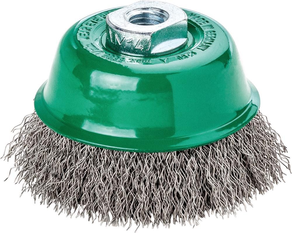 Topfbürste• Rostfreier Stahldraht V4A (1.4401), gewellt • Zur Aufnahme in allen handelsüblichen Einhand-Winkelschleifern • Für den Einsatz bei leichten bis mittelschweren Reinigungsarbeiten und zur Bearbeitung von großen Flächen • Zum Aufrauen und Mattieren sowie zum Entfernen von Farbe, Lack, Grat, Rost, Zunder etc. auf V4A-Oberflächen und vergleichbaren Edelstahlqualitäten Hinweis: Nicht zur Bearbeitung von V2A-Stählen geeignet.