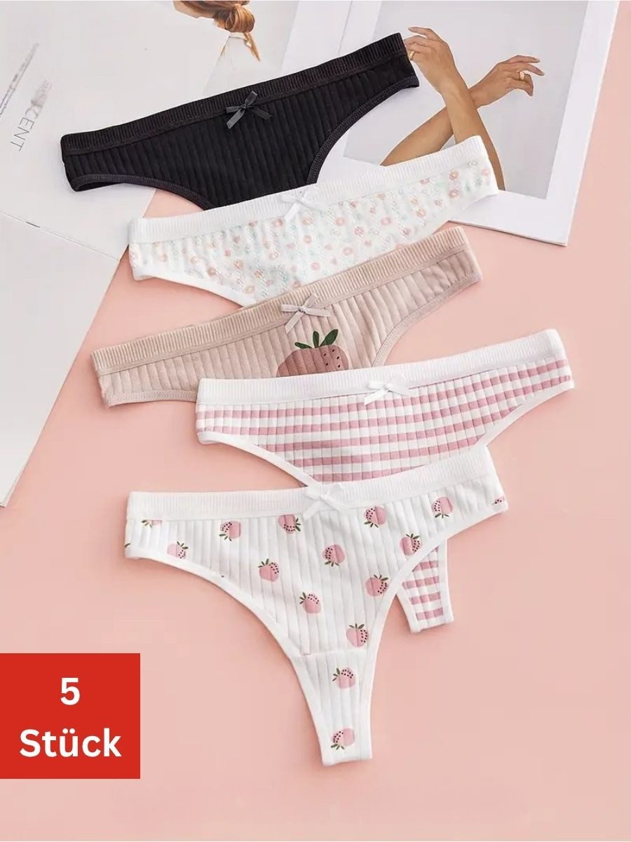 Dieser elegante Damen Tanga V-String im 5er-Pack bietet Ihnen nicht nur Bequemlichkeit, sondern auch einen Hauch von Stil. Hergestellt aus hochwertigem Material, garantiert dieser Tanga ein angenehmes Tragegefühl den ganzen Tag über. Die süßen Muster sorgen für eine verspielte, feminine Note und machen ihn zu einem unverzichtbaren Bestandteil Ihrer Unterwäschekollektion. Perfekt für jeden Anlass – ob täglich oder für besondere Momente. Der Tangaslip bietet eine perfekte Passform, die Ihre Figur vorteilhaft betont, und sorgt gleichzeitig für höchsten Komfort. Ideal für Frauen, die auf Qualität und Stil nicht verzichten möchten.Farbe | mehrfarbig |