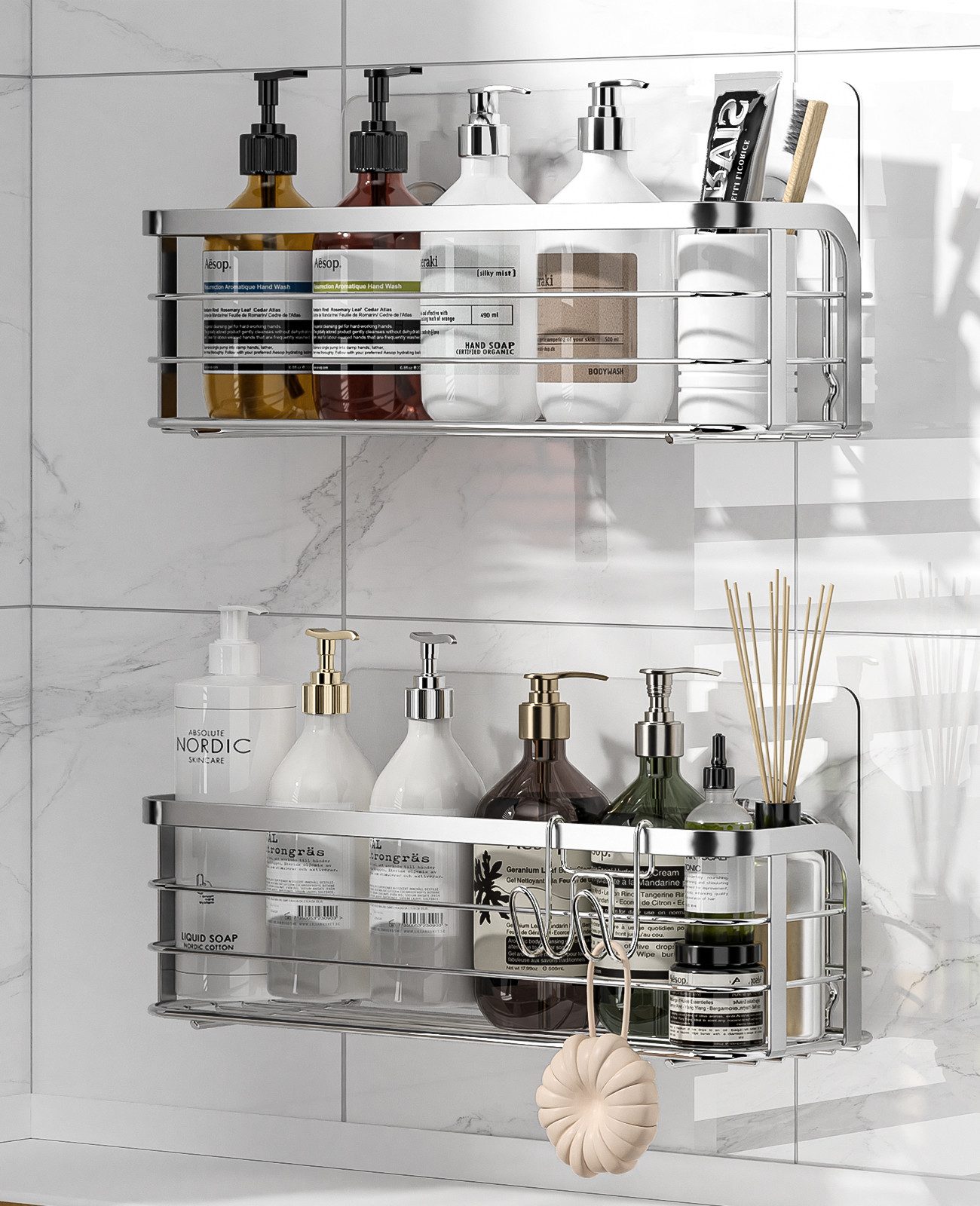 Lieferumfang | 2 x Rechteckige Duschkorb( Großer Duschablage: 31x12,5x9,5 cm; Kleiner Duschablage: 29x10x7,5 cm) 1 x Abnehmbare Haken 3 x Klebepads 1 x Handbuch |