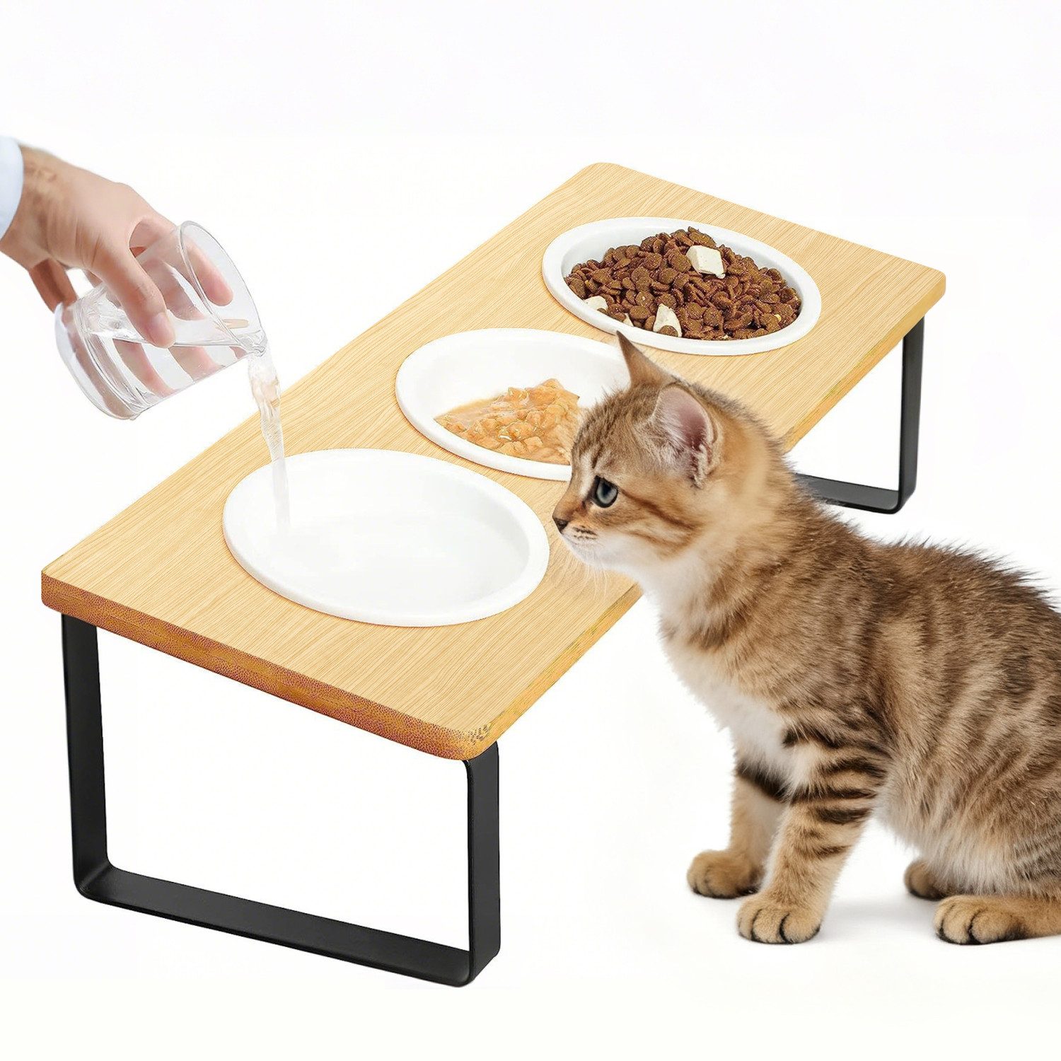 Lieferumfang | 1 × Bambusgestell mit Metallrahmen 3 × Keramiknäpfe 4 × rutschfeste Fußpads 4 × Sechskantmuttern 1 × Innensechskantschlüssel |