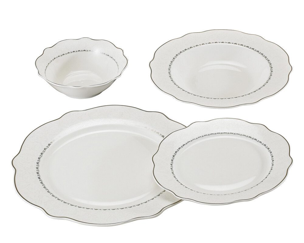 Dieses elegante 24-teilige Geschirrset aus Porzellan in klassischem Weiß mit einer feinen Silberumrandung ist perfekt für stilvolle Tischdekorationen und besondere Anlässe. Mit seinem edlen, wellenförmigen Randdesign und den dezenten Verzierungen bringt es eine gehobene Note auf jeden Tisch. Ideal für Dinnerpartys, festliche Anlässe oder den täglichen Gebrauch.