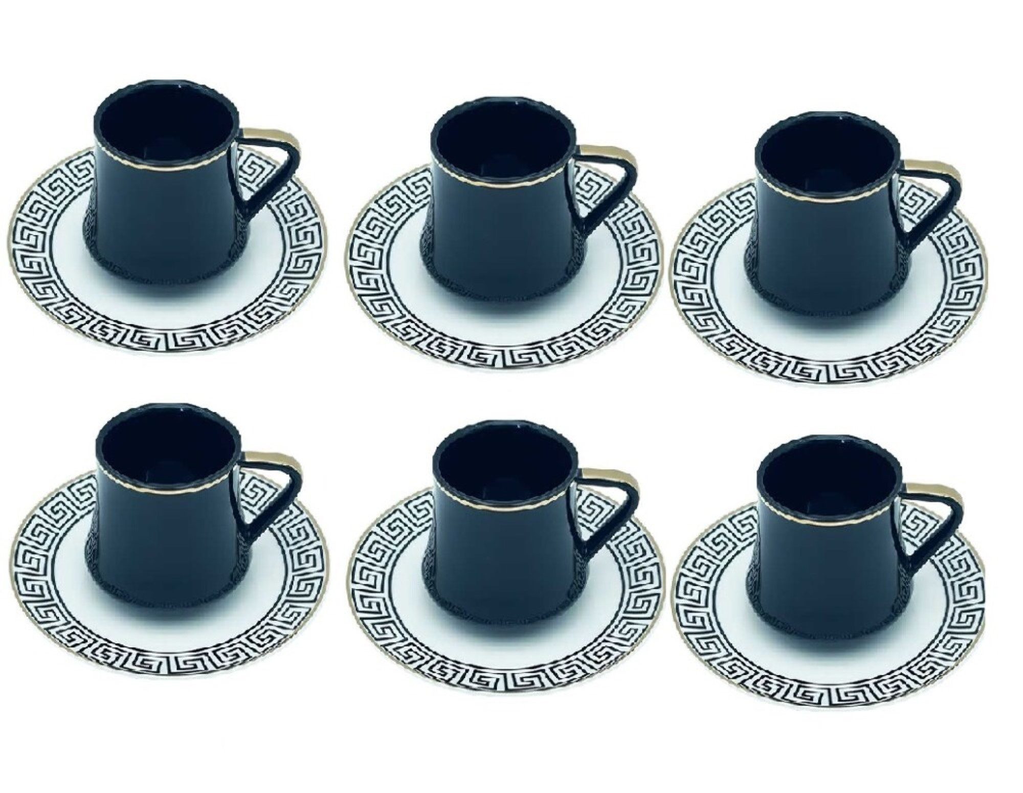 Design: Elegantes Schwarz und Weiß mit goldfarbenem Rand an den Tassen und klassischem griechischen Muster auf den Untertellern.