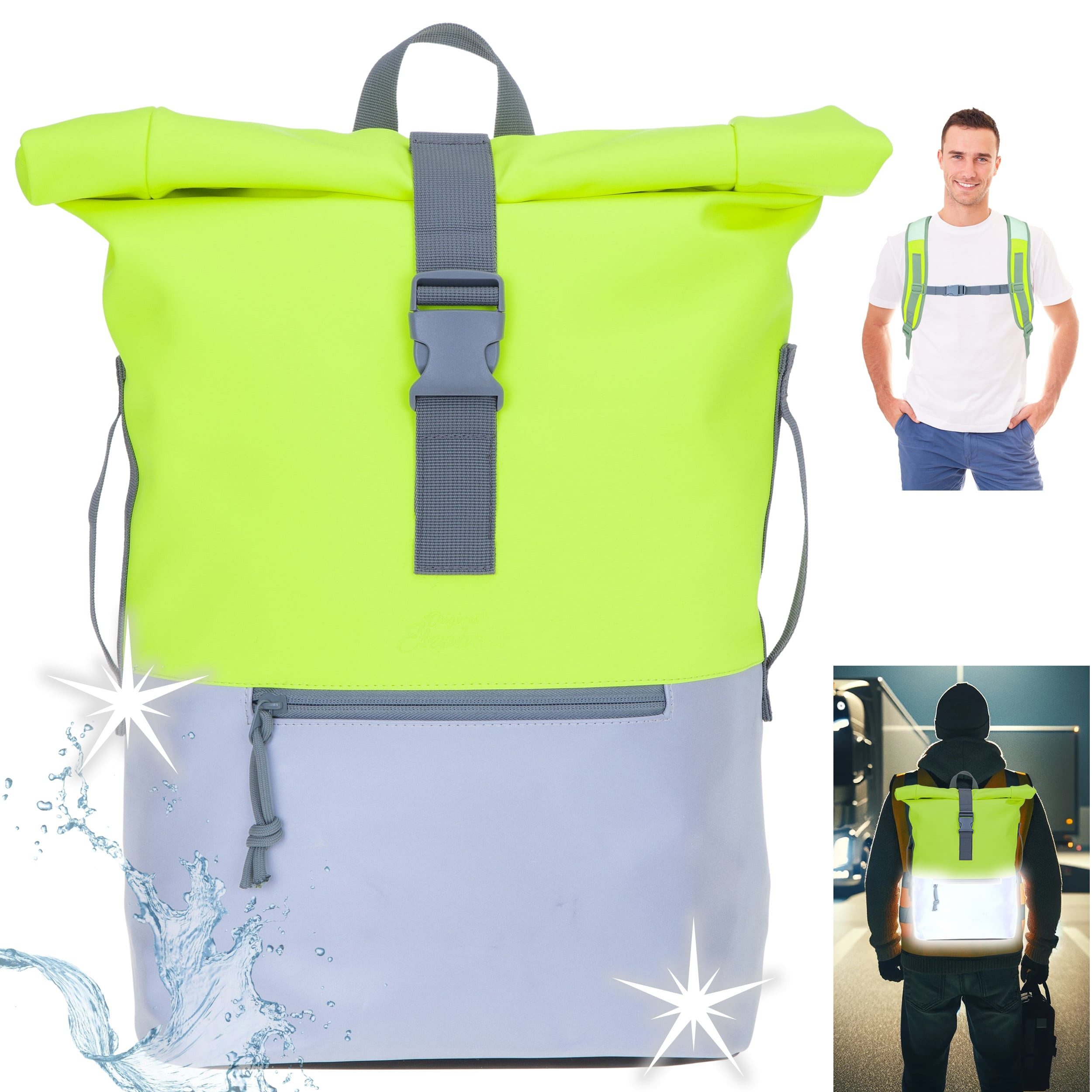 Materialhinweis | 1/3 des Rucksack reflektiert, wenn er angeleuchtet wird |