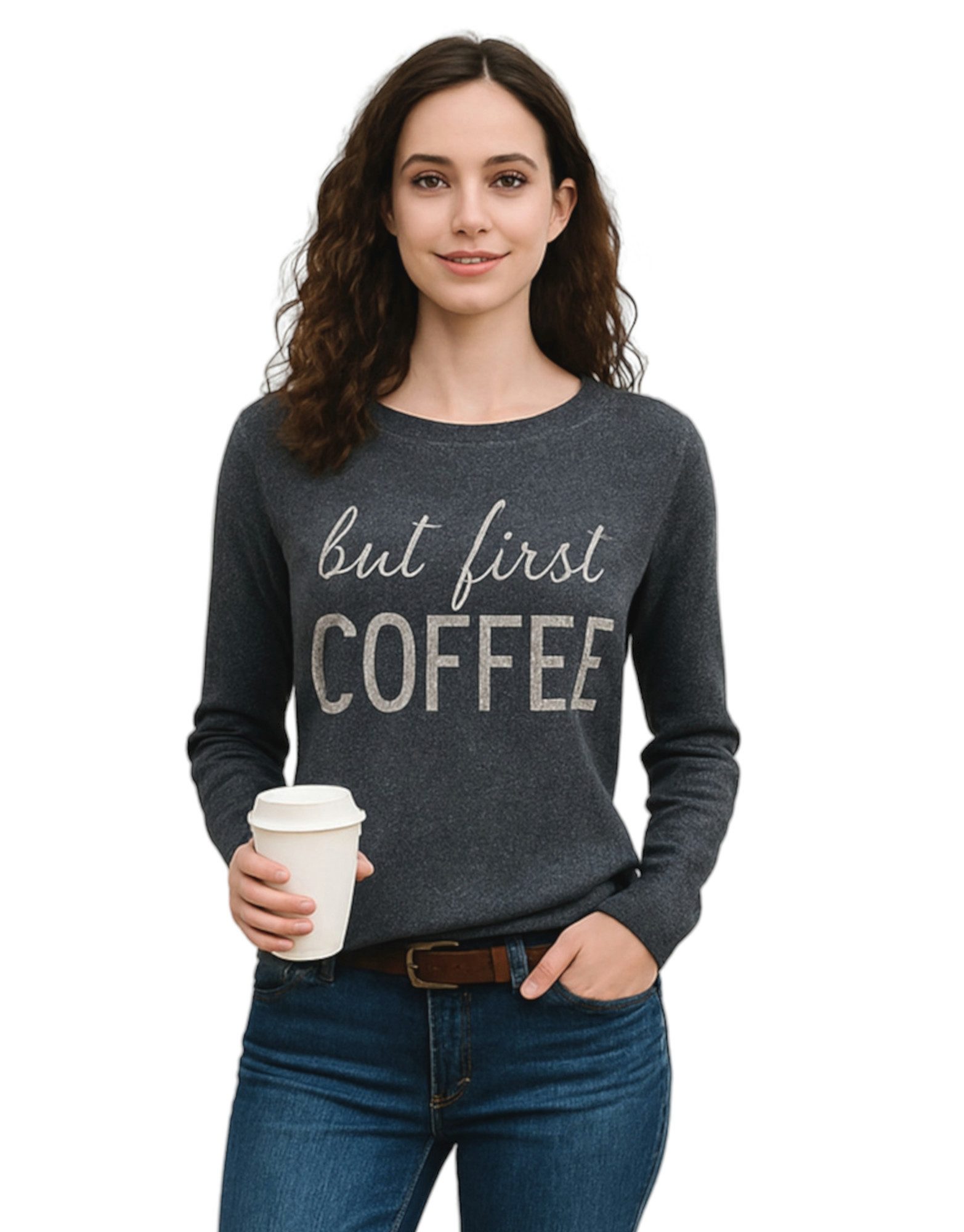 Dieser Damen Pullover verbindet eine feine Strickart mit entspannter Passform und klassischem Rundhalsausschnitt. Die Vorderseite mit der Aufschrift „But first Coffee“ setzt ein stylisches Statement, die Rückseite bleibt unifarben für vielseitige Outfits. Hergestellt in Italien – für Qualität, die man sieht und spürt.