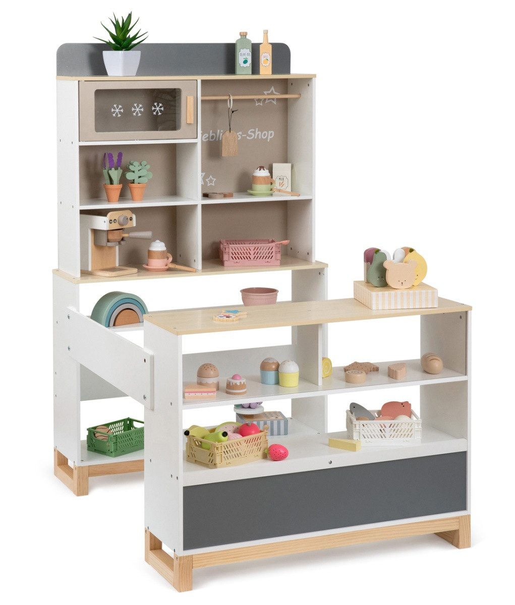 Mit dem Kaufmannsladen VENDY von ELLA & PIET® erleben Ihre Kinder ein unvergleichliches Einkaufserlebnis. Dieser große Kaufladen bietet nicht nur eine hohe Standfestigkeit, sondern auch zahlreiche besondere Features, die das Spielen noch realistischer machen. Mit der Kuchenauslage und dem Eisfach können die kleinen Verkäufer ihre Leckereien perfekt präsentieren. Die Kuchenauslage verfügt über eine Acrylglasscheibe, die dafür sorgt, dass die Köstlichkeiten sicher und hygienisch präsentiert werden können. Das Eisfach hält das Spielzeugeis immer schön kühl und bietet den Kunden ein erfrischendes Vergnügen an heißen Sommertagen. Zusätzlich können zwei Tafeln individuell beschriftet werden, um den Namen des Ladens oder spezielle Angebote hervorzuheben. So verwandelt sich der Kaufladen schnell in eine Bäckerei, einen Marktstand oder einen Supermarkt - die Möglichkeiten sind endlos! Die breite Theke und die großzügigen Fächer bieten ausreichend Platz zum Anbieten einer Vielzahl von Waren. Ob Obst, Gemüse oder Brot und Brötchen – hier findet alles seinen Platz! Der Kaufmannsladen ist aus hochwertigem Echtholz und MDF gefertigt und besticht durch seine langlebige Qualität. Mit diesem liebevoll gestalteten Kaufmannsladen fördern Sie nicht nur die Fantasie und Kreativität Ihrer Kinder, sondern auch deren soziale Kompetenzen. Sie lernen spielerisch den Umgang mit Geld und das Interagieren mit anderen Kindern. Der Kaufladen ist nicht nur optisch ein Blickfang in jedem Kinderzimmer, sondern auch eine Bereicherung für jedes Spielabenteuer. Er wird zerlegt geliefert und kann in einfachen Schritten aufgebaut werden. Die Dekoration gehört nicht zum Lieferumfang.