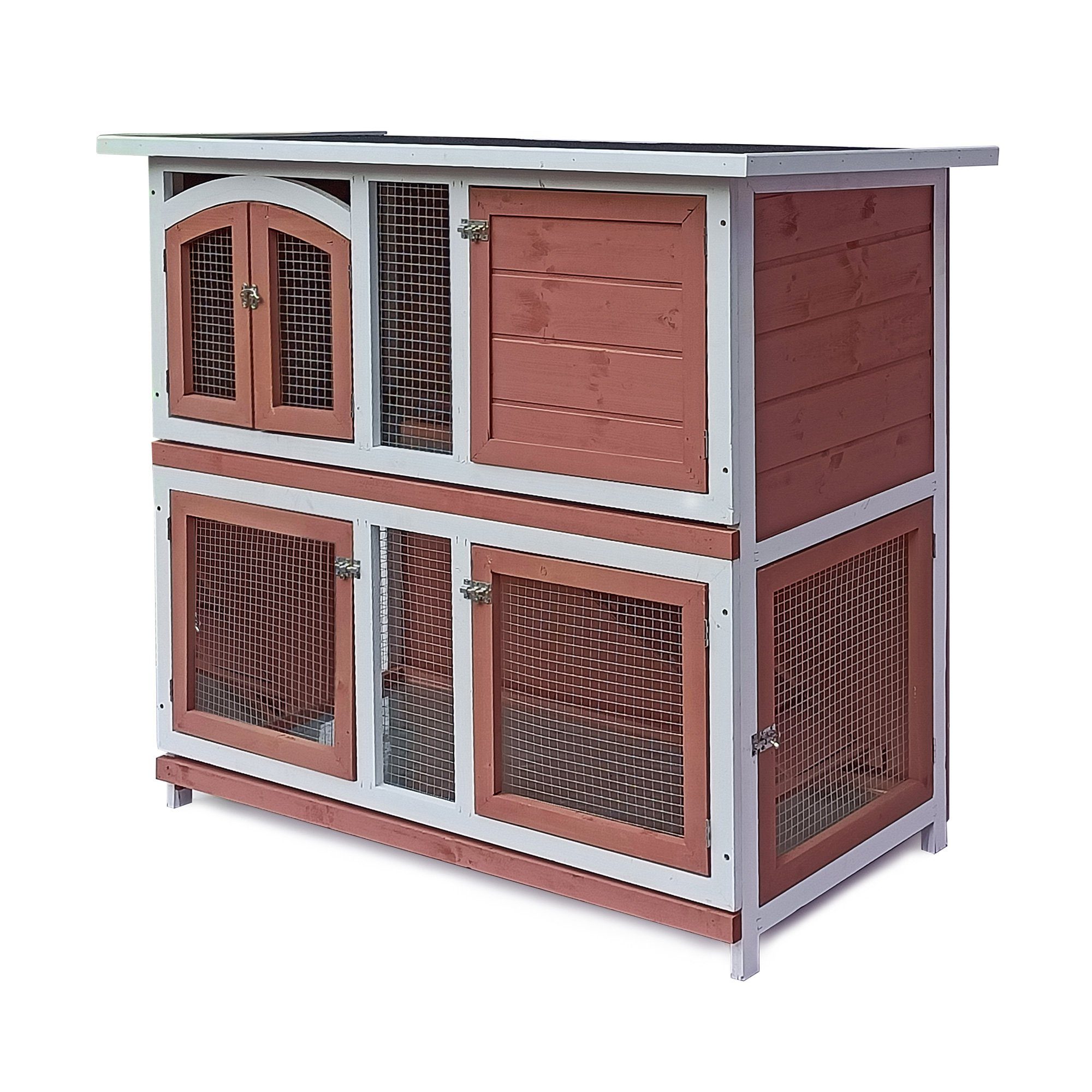 Klassisches Eigenheim für Hasen und Kaninchen Mit dem Elmato Kaninchenstall Harry holen Sie sich ein wetterfestes und edles Nagerzuhause in Ihren Garten. Das Eigenheim für Nager unterteilt sich in zwei Stockwerke, die von Ihren Tieren zum schlafen, fressen und ausruhen genutzt werden können. Die beiden Bereiche sind durch eine Verbindungstreppe miteinander verbunden. Dabei können Ihre Tiere frei entscheiden, auf welcher Etage sie sich aufhalten möchten. Um die Reinigung zu vereinfachen, lassen sich das Dach und 5 Türen im kompletten Nagertraum aufklappen. Obendrein besteht der Stallboden auf beiden Etagen aus zwei Blechwanne, um das Holz vor Urin und Kot zu schützen. Vorteile im Blick: • Maße Stall: ca. 108 x 52 x 109 cm (vorn) / 105 cm (hinten) • Maße nur Dach: ca. 120 x 60 cm • Draht Maschenweite ca. 15 x 15 cm • 2-stöckig, mit Verbindungstreppe • Fichtenholz • wetterfest imprägniertes Holz • Klassischer Kaninchenstall zur Freihaltung • Schlafbereich und Stallbereich durch Öffnungsluke verbunden • 5 Holztüren zum Öffnen • optimale Luftzirkulation • abgeschrägtes Dach mit Dachpappe • Dach aufklappbar für leichte Reinigung • 2 ausziehbare Blechwannen als Stallboden auf beiden Etagen • optimale für mehrere Tiere: Meerschweinchen, Hasen, Kaninchen • Verzinkter Draht, tierfreundlich eingearbeitet, keine scharfen Ecken und Kanten • Bausatz mit Schrauben und Aufbauanleitung