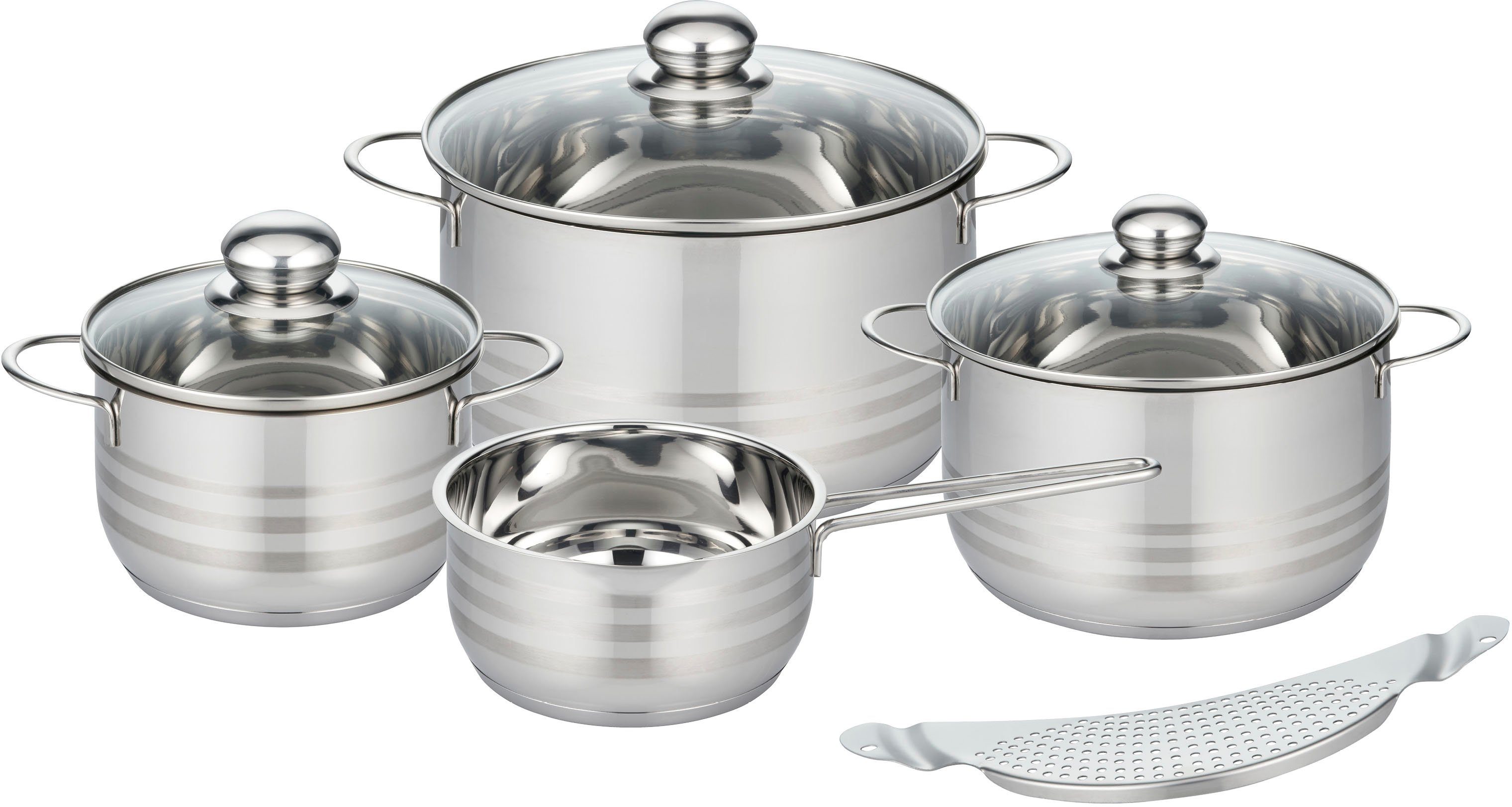 Lieferumfang | 1 x Abgießhilfe 1 x Fleischtopf mit Glasdeckel 16x9,5 cm, 1,6 Liter 1 x Fleischtopf mit Glasdeckel 20x11,5 cm, 3,2 Liter 1 x Fleischtopf mit Glasdeckel 24x13,5 cm, 5,4 Liter 1 x Stielkasserolle ohne Deckel 16x7,5 cm, 1,3 Liter |