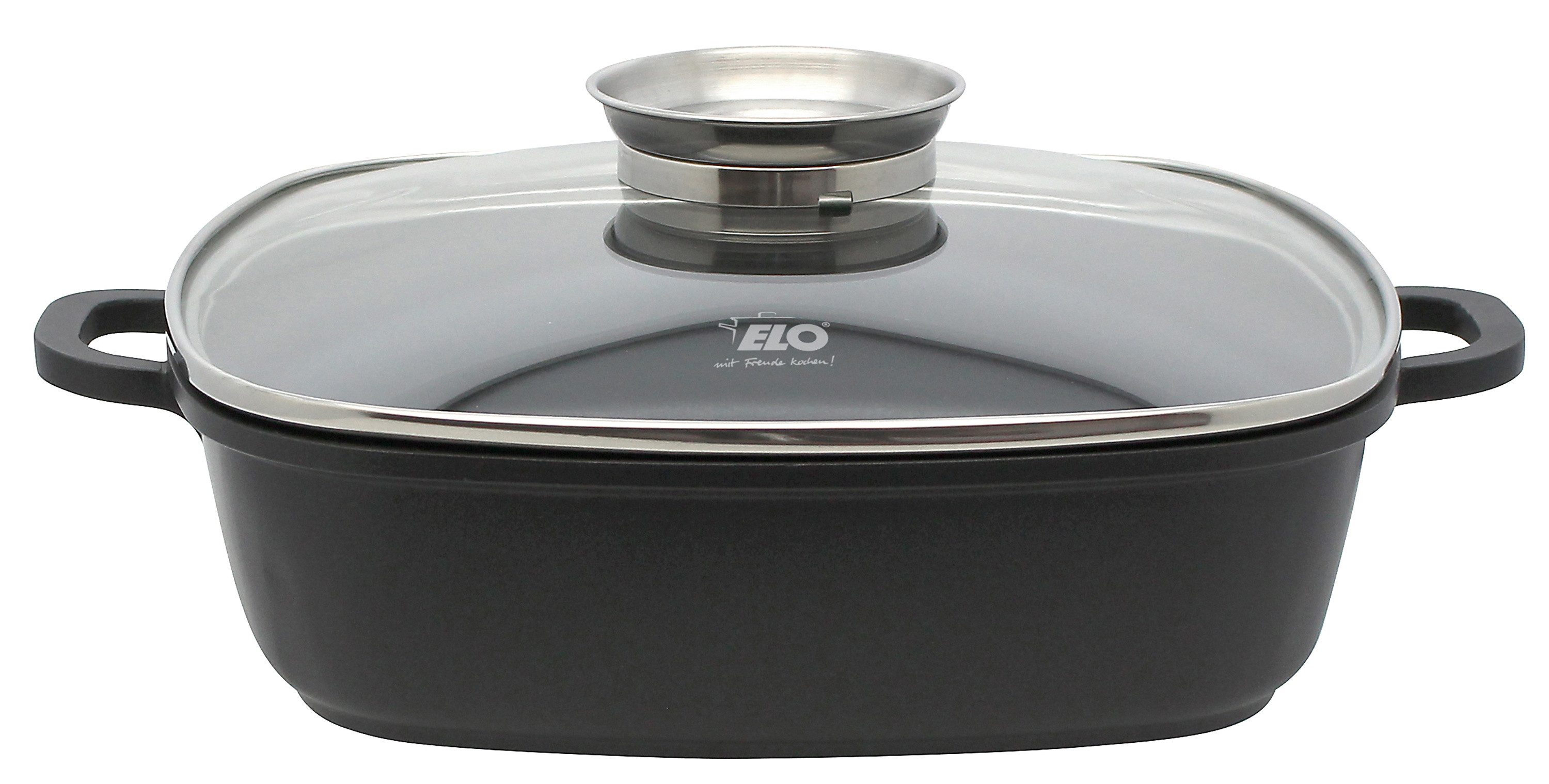 · mit Glasdeckel · hochwertiger Aluminiumguss · 3,60 Liter Fassungsvermögen · Wandstärke ca. 2,0 mm · Bodenstärke ca. 4,5 mm · Gelochter Induktionsboden · innen schwarze hochwertige, kratzfeste ELODUR Select Antihaftversiegelung · außen schwarz Silikon Polyester beschichtet · eingearbeitete Seitenbeschlag- teile aus Aluguss · Glasdeckel mit stoßfestem Edelstahlrand und Aromaknopf · sehr leichte Reinigung, da nichts haften bleibt · gleichmäßige Wärmeverteilung bis zum Rand, spart Zeit und Energie · spülmaschinengeeignet · backofenfest bis 240°C, mit Glasdeckel bis 180°C · induktionsgeeignet