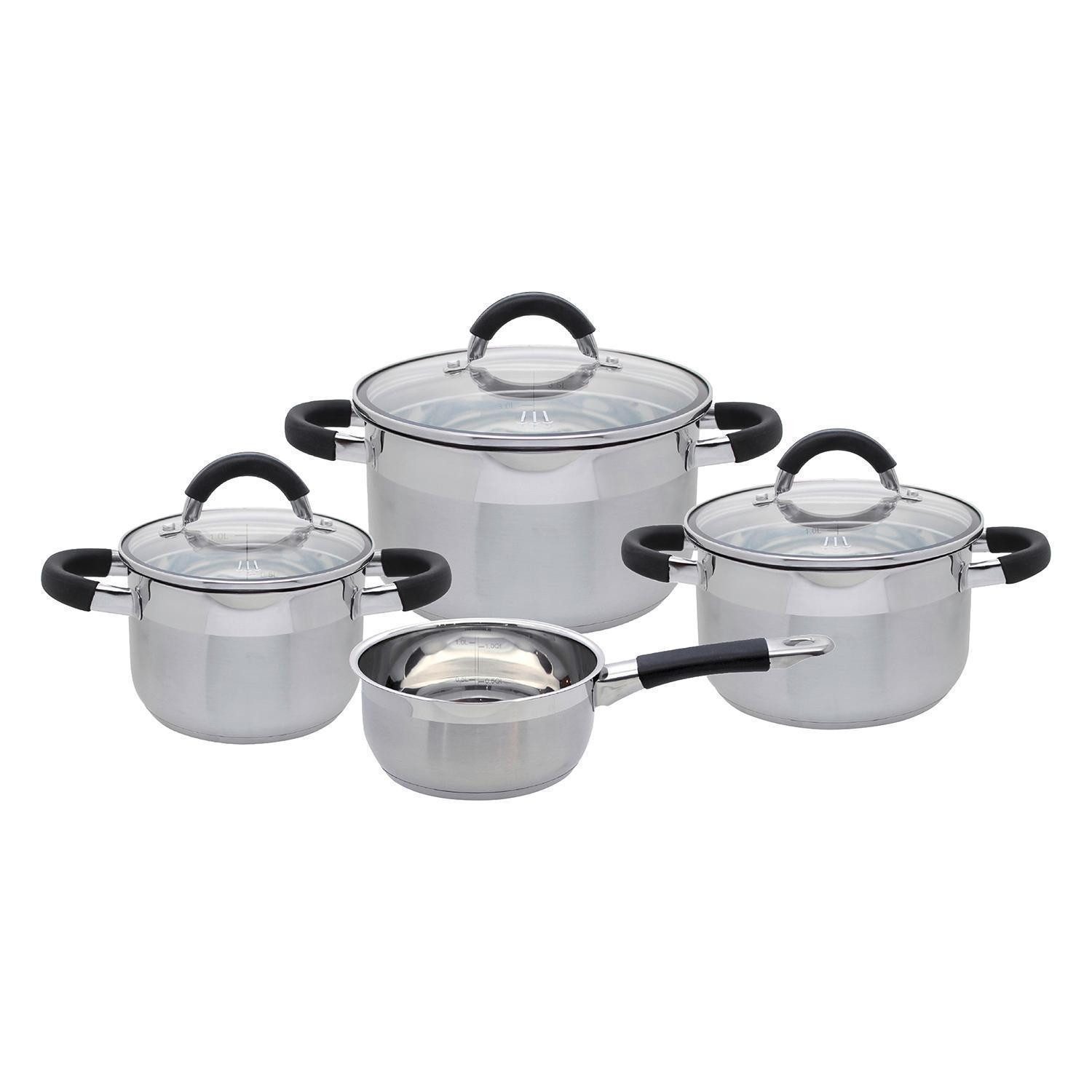 Lieferumfang | 4-teiliges Topf-Set: 3 Kochtöpfe mit Glasdeckel und 1 Stielkasserolle ohne Deckel |