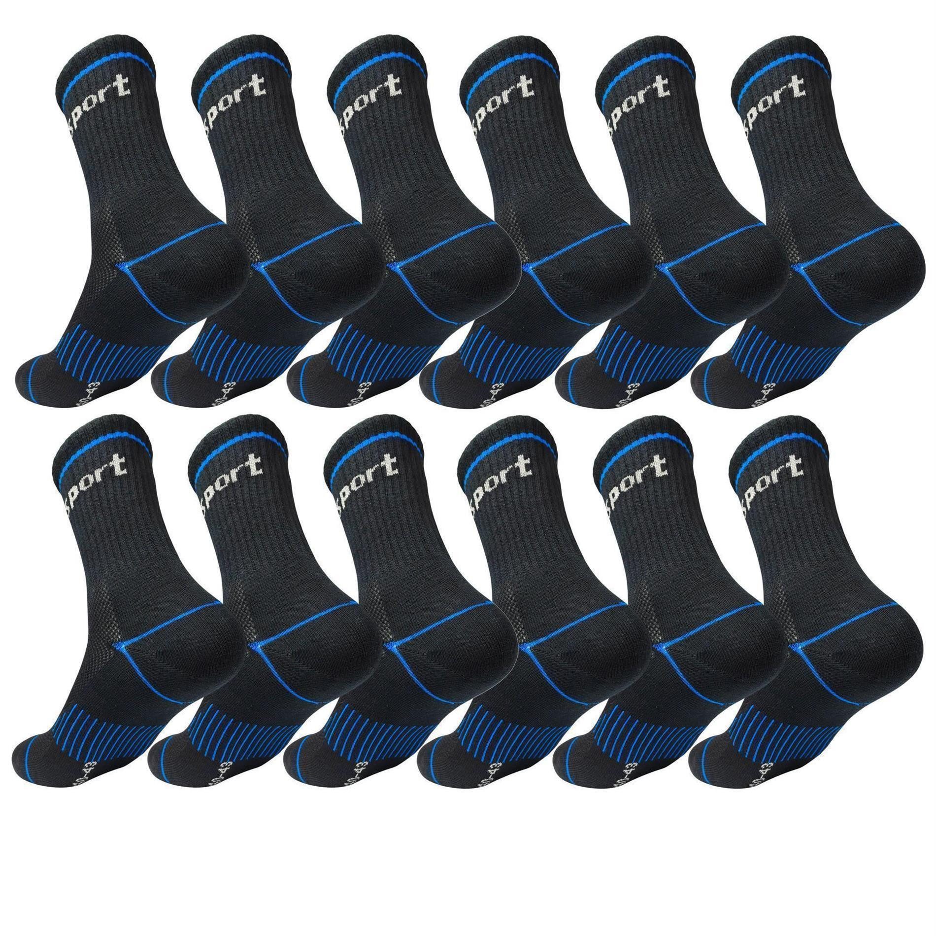 Der elastische Bund verhindert Einschneiden oder Rutschen und garantiert einen optimalen Sitz. Dank des schlichten schwarzen Designs mit dezenten blauen Streifen und „Sport“-Logo passen die Socken zu jedem Outfit.