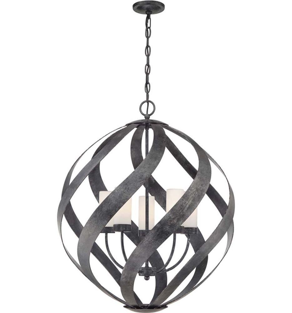 Die kühne Schmiedearbeit des Schmieds ist eine spiralförmige Sensation und bewegt sich in sanften Kurven entlang einer kugelförmigen Silhouette. Das altschwarze Finish enthält Akzente aus Holzkohle und dunklem Silber für einen sinnlichen, rauchähnlichen Effekt. Die Kerzen sind mit zylindrischen Schirmen aus Milchglas ausgestattet, die das Licht dieser atemberaubenden Kollektion mildern. Diese nach IP44-Spezifikation hergestellte Serie ist ideal für Wohnbereiche im Freien.