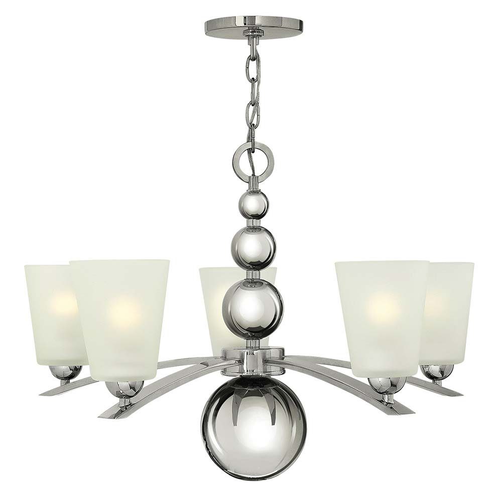 Die markante Mid-Century-Silhouette von Zelda besteht aus Metallkugeln mit poliertem Nickel, die an Размер zunehmen, wenn sie von der oberen Schlaufe absteigen und eine elegante nahtlose Mittelsäule bilden. Die schlanken, rechteckigen, geschwungenen Arme tragen konische, geätzte Glasschirme, die auf einer halbkugelförmigen Tasse sitzen und Vintage-Appeal verleihen.