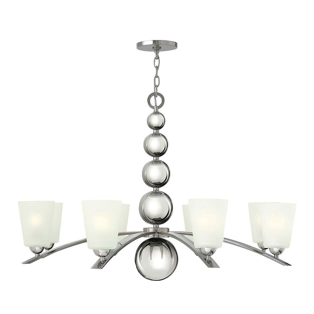 Die markante Mid-Century-Silhouette von Zelda besteht aus Metallkugeln mit poliertem Nickel, die an Размер zunehmen, wenn sie von der oberen Schlaufe absteigen und eine elegante nahtlose Mittelsäule bilden. Die schlanken, rechteckigen, geschwungenen Arme tragen konische, geätzte Glasschirme, die auf einer halbkugelförmigen Tasse sitzen und Vintage-Appeal verleihen.
