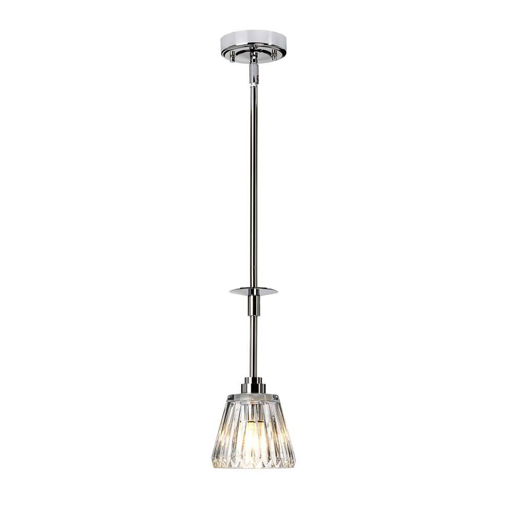 Die Agatha-Reihe ist IP44 für Badezimmer, kann aber dennoch in Fluren und anderen Wohnräumen verwendet werden. Eine integrierte LED beleuchtet den Acrylstab der Wandleuchte und 3-flammigen Pendelleuchte. Licht funkelt bei allen Modellen durch klar geschliffene Glasschirme. Das Меню ist in zwei Ausführungen erhältlich, poliertes Chrom und gebürstetes Nickel.