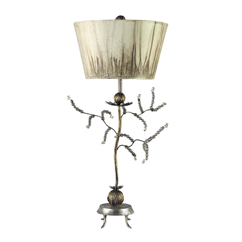 Tischlampe mit einem säuregewaschenen Schirm in invertierter Kittfarbe und zarten Blattgoldzweigen, die geschliffene Glasjuwelen auf einem Blattgold-Metallstiel stecken.