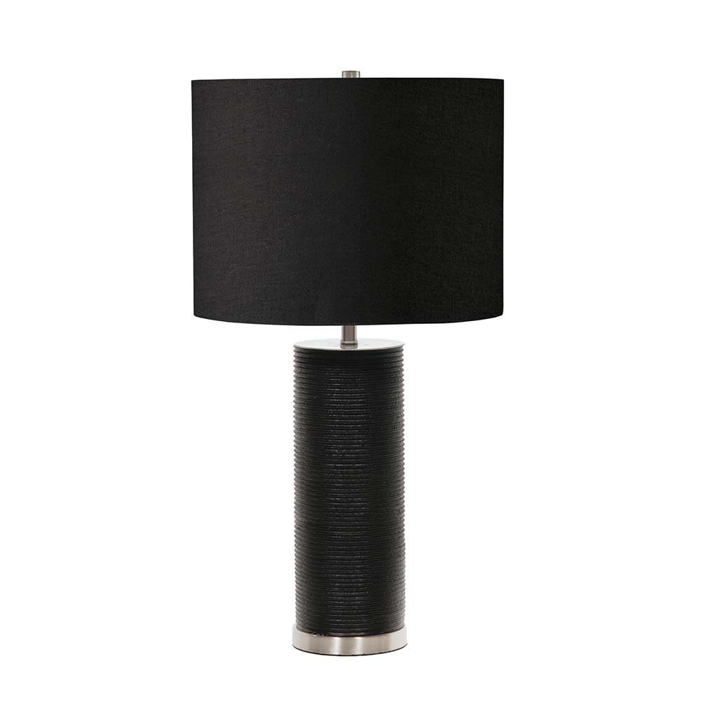 Tischlampe aus schwarzem Harz mit Akzenten aus poliertem Nickel. Enthält einen schwarzen Kunstleinenschirm mit fester Rückseite.