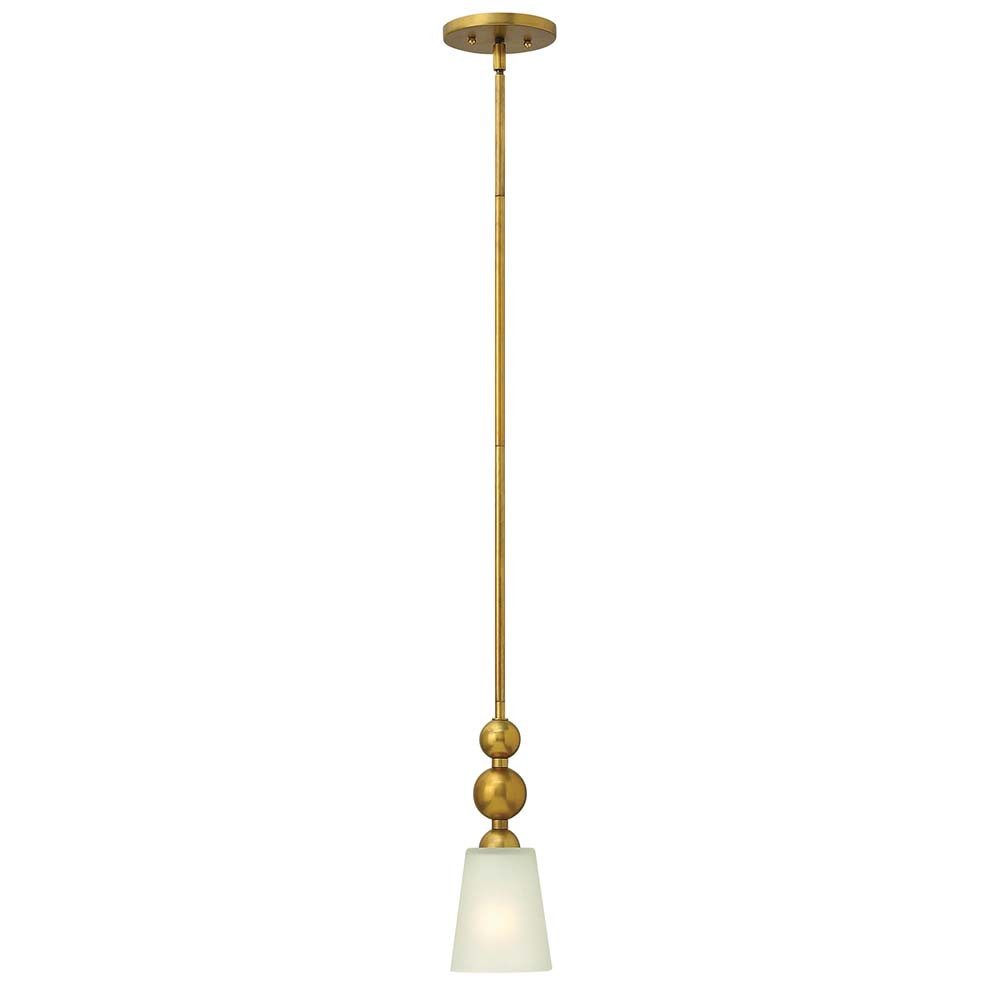 Die markante Mid-Century-Silhouette von Zelda besteht aus Metallkugeln mit Vintage-Messing, die an Размер zunehmen, wenn sie von der oberen Schlaufe absteigen und eine elegante nahtlose Mittelsäule bilden. Die schlanken, rechteckigen Bügel tragen konische Schirme aus geätztem Glas, die auf einer halbkugelförmigen Tasse sitzen und Vintage-Appeal verleihen.