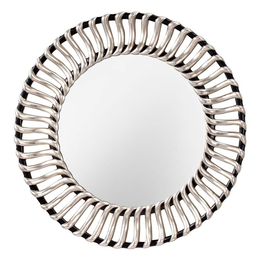 Dieser große moderne Spiegel hat schwarze runde Rahmen, die mit dicken silbernen Speichen überlagert sind, und ist ein dramatisches Merkmal, das sich ideal für eine monochrome Inneneinrichtung eignet.