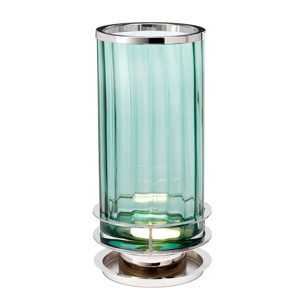 Obelisk-Tischlampe aus mundgeblasenem Glas mit prismatischer Textur und grüner Tönung. Die Lichtquelle ist im Sockel mit feinen Metalldetails in poliertem Nickel versteckt.