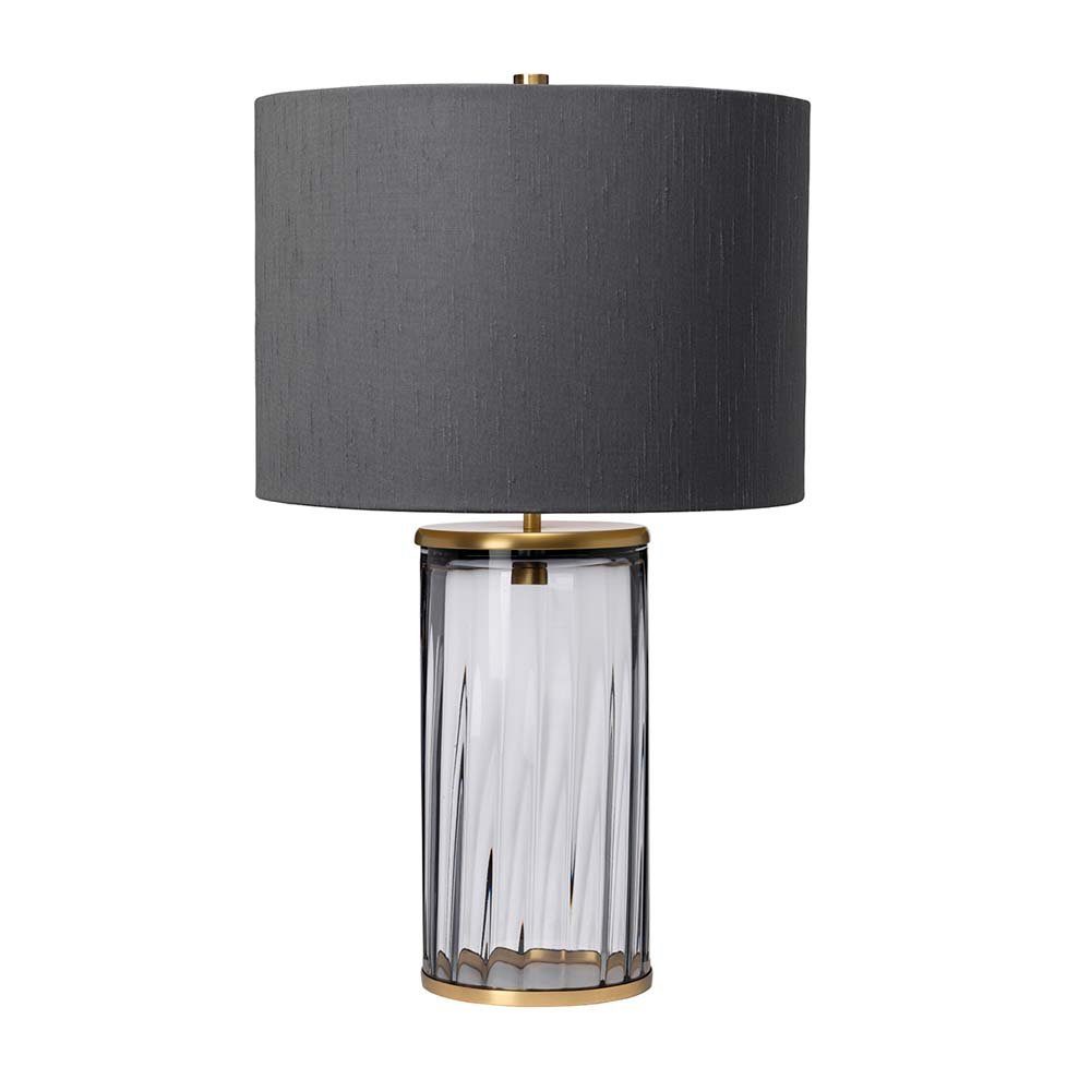 Tischlampe aus mundgeblasenem Glas mit prismatischer Textur und rauchiger Tönung. Abgerundet mit Details aus gealtertem Messing und einem Lampenschirm aus walgrauer Kunstseide mit goldmetallischer Innenseite.