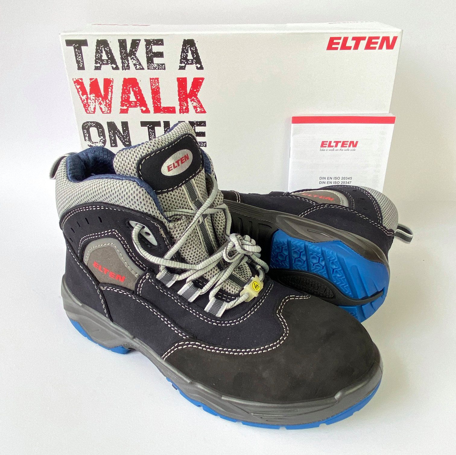 Elten Sicherheitstiefel RUNABOUT Mid ESD S2 SRC – Robuste Arbeitsstiefel für optimalen Schutz und Tragekomfort Die Elten Sicherheitsschuhe Damen und Herren Stiefel bieten optimalen Schutz und hohen Tragekomfort für warme Arbeitstage. Das hydrophobierte Nubukleder in Kombination mit hydrophobiertem Mikrofaser-/Meshmaterial sorgt für Strapazierfähigkeit und Wasserabweisung, während das atmungsaktive Textilfutter ein angenehmes Fußklima gewährleistet. Für maximale Sicherheit sind die Arbeitsschuhe mit einer robusten Stahlkappe ausgestattet, die den Fuß vor Stößen und Druckbelastungen schützt. Die semi-orthopädische Einlegesohle ESD grey und die ESD-fähige Softvlies-Brandsohle bieten hervorragenden Tragekomfort und verhindern elektrostatische Aufladung. Die rutschhemmende TPU/PU-Sohle DIMENSION PRO sorgt für optimalen Halt auf verschiedenen Untergründen, während das reflektierende Material für bessere Sichtbarkeit bei schlechten Lichtverhältnissen sorgt. Zusätzlich sind die Elten Stiefel für orthopädische Einlegesohlen geeignet, was individuellen Tragekomfort ermöglicht. Perfekt für alle, die Schutz, Komfort und Atmungsaktivität in einem leichten Schuh vereinen möchten.