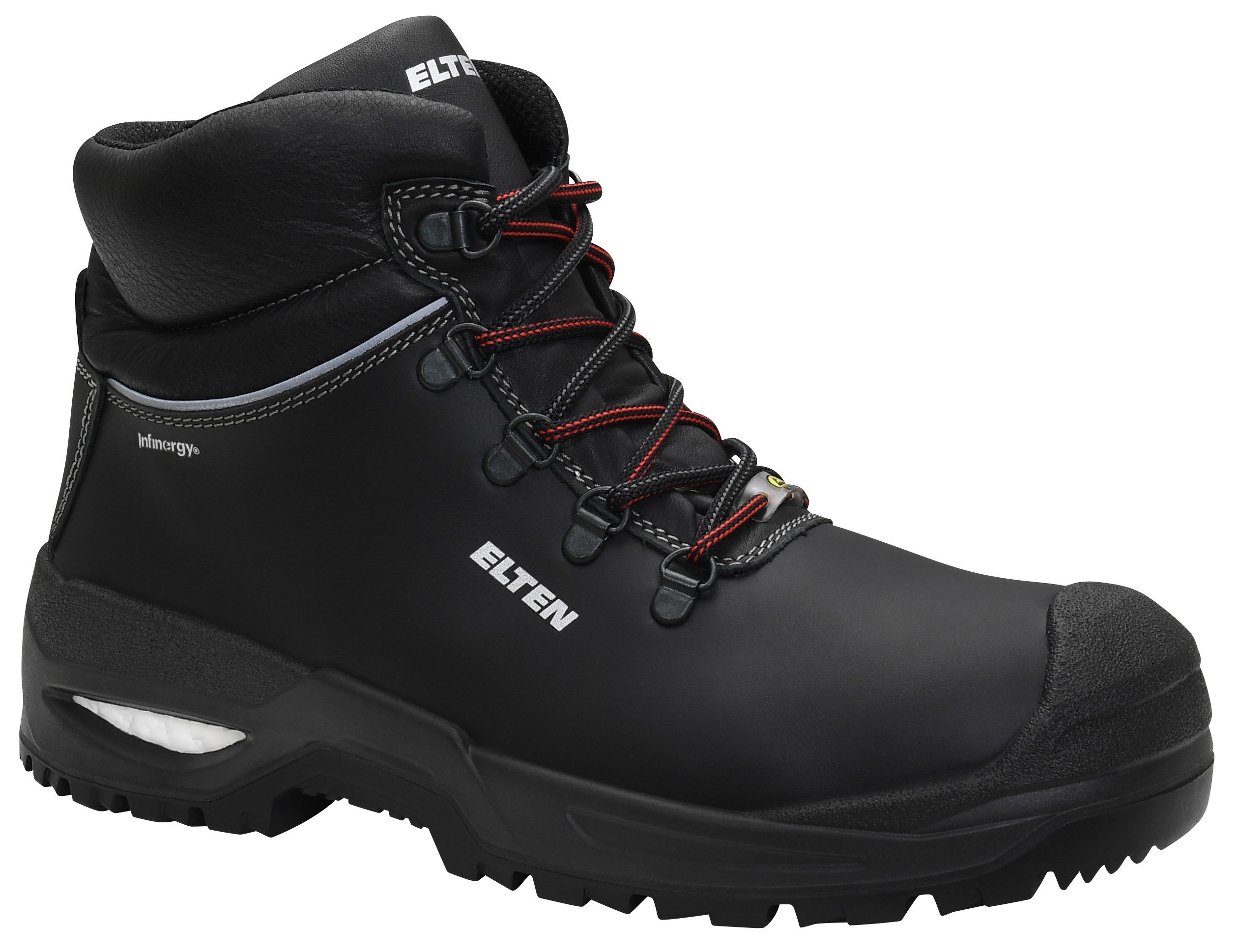 ELTEN - GEMACHT AUS LEIDENSCHAFT - 1910 in Uedem am Niederrhein von Johann van Elten gegründet, brachte seine Vision den Durchbruch für den modernen Sicherheitsschuh, wie wir ihn heute kennen: die revolutionäre Erfindung des ersten ELTEN Arbeitsschuhes aus Leder statt wie damals üblich aus Holz. Heute gehört ELTEN zu den führenden Herstellern von hochwertigen Sicherheits- und Berufsschuhen in Europa mit einer Jahresproduktion von über 3 Mio. Paar, produziert in Uedem am Niederrhein. Aus dieser Tradition heraus stehen für uns der Mensch, sein Schutz und seine Sicherheit im Mittelpunkt unserer Arbeit. === ELTEN Sicherheitsschnürstiefel, FRANCESCO XXSG black Mid ESD S3, 768721, ELTEN WELLMAXX, Rindleder, Atmungsaktives Textilfutter, Geschlossene, gepolsterte Lasche, Ganzflächige Einlegesohle ARTISAN ESD, PU/PU Sohle WELLMAXX SAFETY GRIP, EN ISO 20345 S3 SRC, Form B
