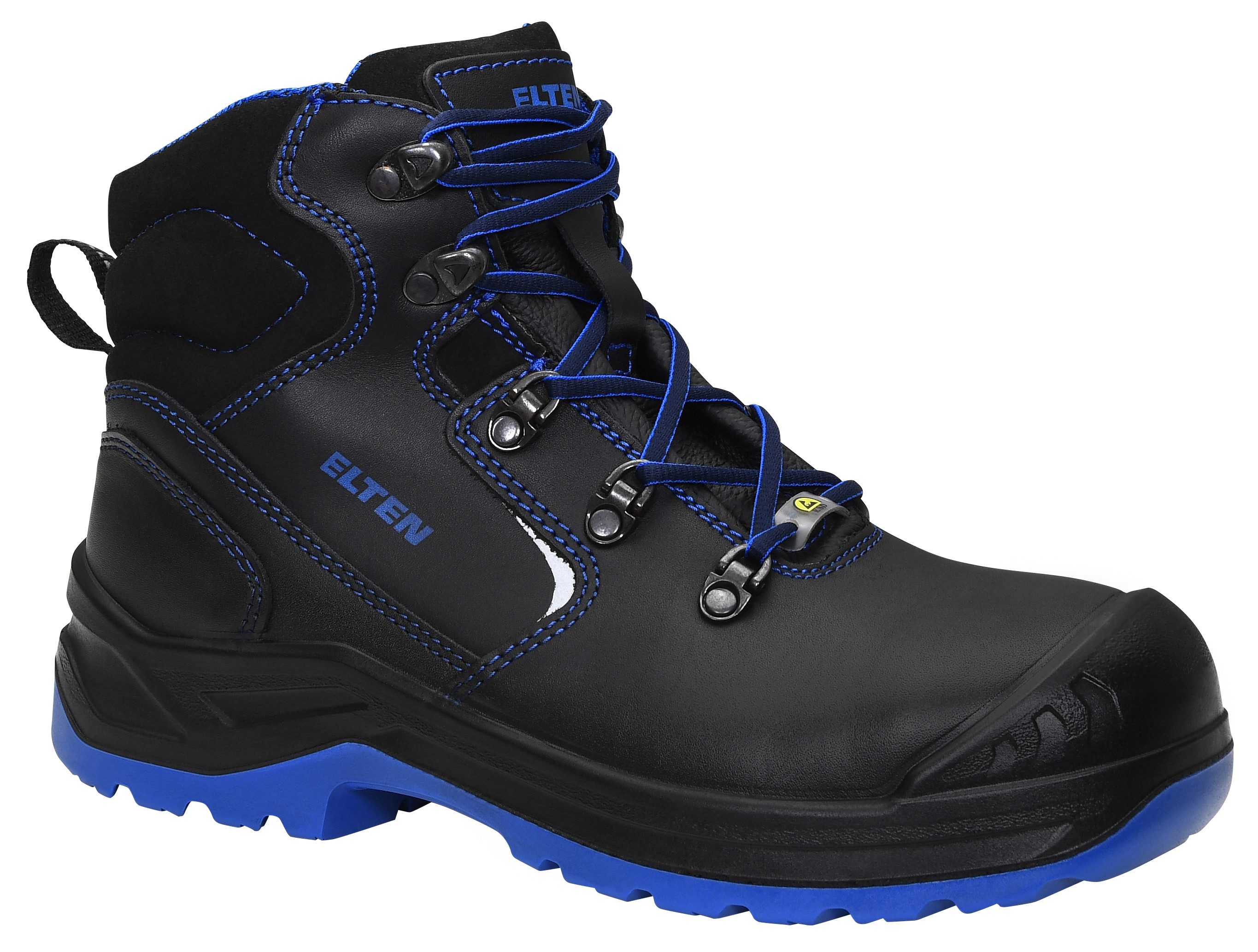 ELTEN - GEMACHT AUS LEIDENSCHAFT - 1910 in Uedem am Niederrhein von Johann van Elten gegründet, brachte seine Vision den Durchbruch für den modernen Sicherheitsschuh, wie wir ihn heute kennen: die revolutionäre Erfindung des ersten ELTEN Arbeitsschuhes aus Leder statt wie damals üblich aus Holz. Heute gehört ELTEN zu den führenden Herstellern von hochwertigen Sicherheits- und Berufsschuhen in Europa mit einer Jahresproduktion von über 3 Mio. Paar, produziert in Uedem am Niederrhein. Aus dieser Tradition heraus stehen für uns der Mensch, sein Schutz und seine Sicherheit im Mittelpunkt unserer Arbeit. === ELTEN Damen-Sicherheitsschnürstiefel, LENA black-blue Mid ESD S3, 746121, ELTEN TREKKING LADY, Rindleder, Atmungsaktives Textilfutter, Ganzflächige Einlegesohle LADIES ESD black, ESD-fähige Softvlies-Brandsohle, PU/PU Sohle TREKKING LADY, EN ISO 20345:2022 S3 FO/SR, Form B