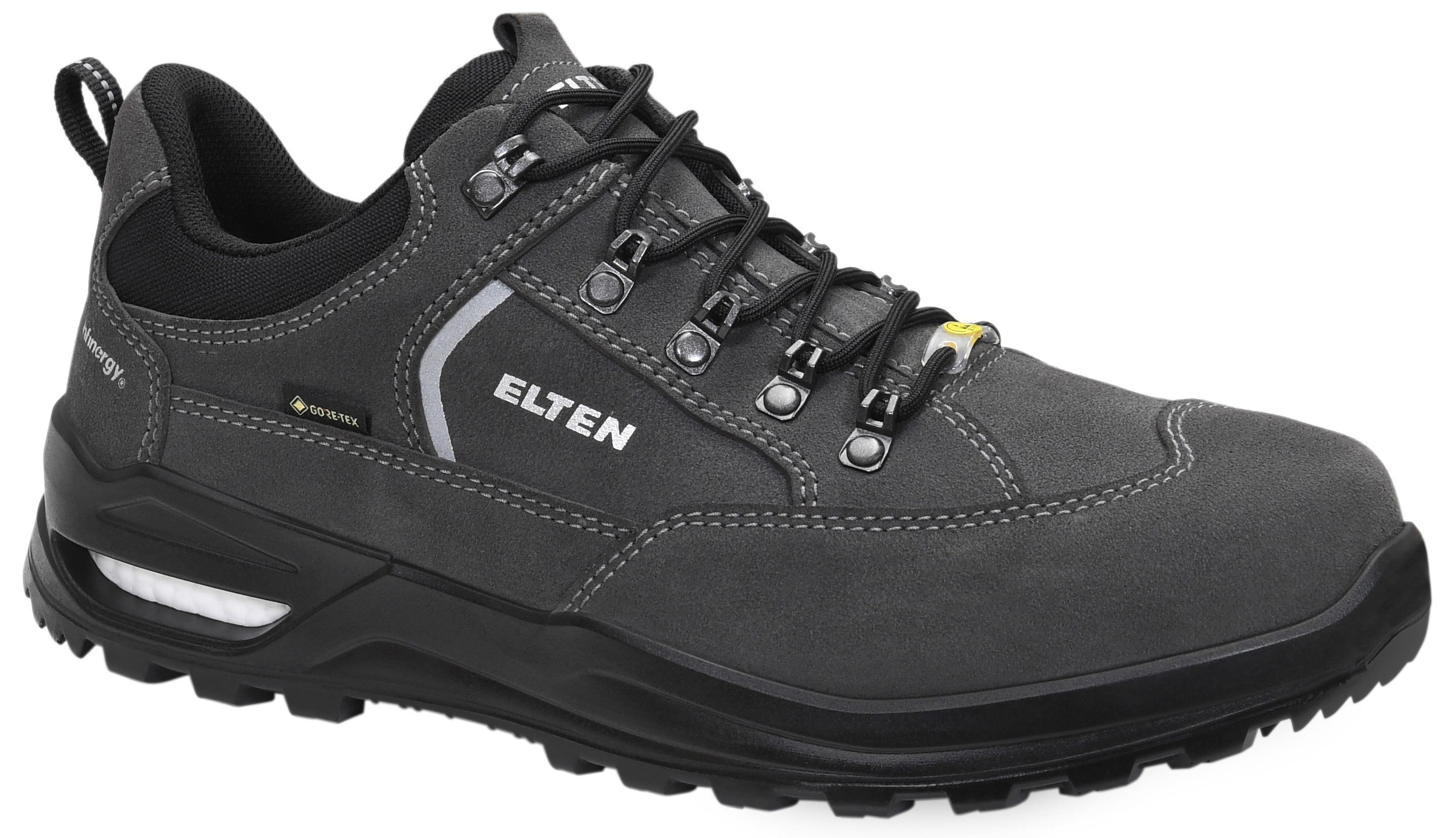 ELTEN - GEMACHT AUS LEIDENSCHAFT - 1910 in Uedem am Niederrhein von Johann van Elten gegründet, brachte seine Vision den Durchbruch für den modernen Sicherheitsschuh, wie wir ihn heute kennen: die revolutionäre Erfindung des ersten ELTEN Arbeitsschuhes aus Leder statt wie damals üblich aus Holz. Heute gehört ELTEN zu den führenden Herstellern von hochwertigen Sicherheits- und Berufsschuhen in Europa mit einer Jahresproduktion von über 3 Mio. Paar, produziert in Uedem am Niederrhein. Aus dieser Tradition heraus stehen für uns der Mensch, sein Schutz und seine Sicherheit im Mittelpunkt unserer Arbeit. === ELTEN Berufshalbschuh, RONAN XXF GTX dark grey Low ESD O2 WR CI, 972620, ELTEN WELLMAXX, Hydrophobiertes Veloursleder, GORE-TEX Performance Comfort Footwear, Geschlossene, gepolsterte Lasche, Ganzflächige Einlegesohle ESD PRO black mit Anteilen aus recycelten Materialien, ESD-fähige Softvlies-Brandsohle, PU/PU Sohle WELLMAXX FLEX, EN ISO 20347:2022 O2 WR/FO/SR/CI, Form A