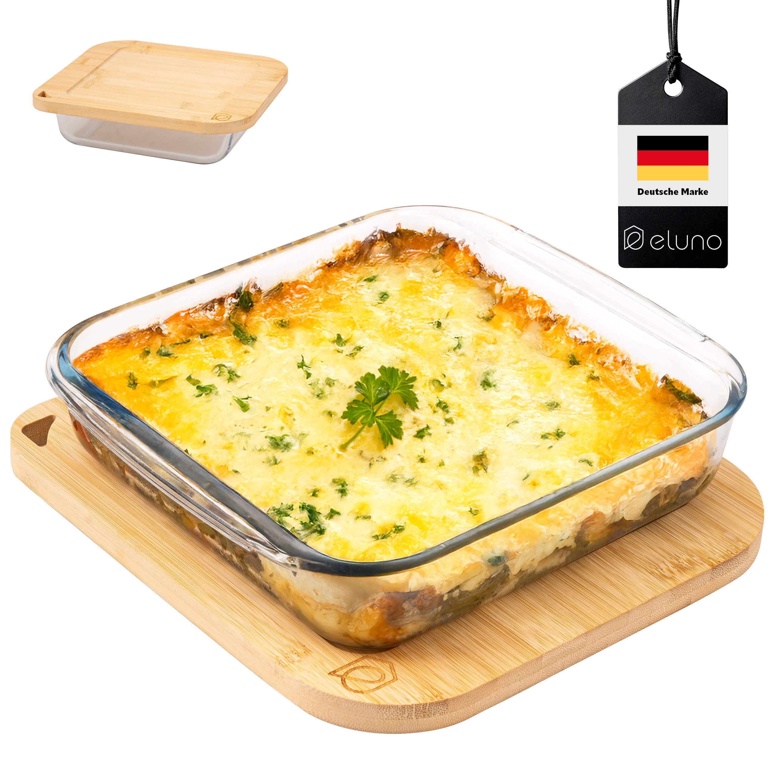 Die Vorteile auf einen Blick:v * vielseitig einsetzbar * Auflaufform aus Borosilikatglas * temperaturbeständig von -20°C bis ca. 400°C * Schale spülmaschinenbeständig * Deckel aus Bambus * plastikfrei * Schale ca. 24,5 x 4,5 x 22 cm (B/H/T) * Deckel ca. 26 x 1,5 x 23,5 cm (B/H/T)
