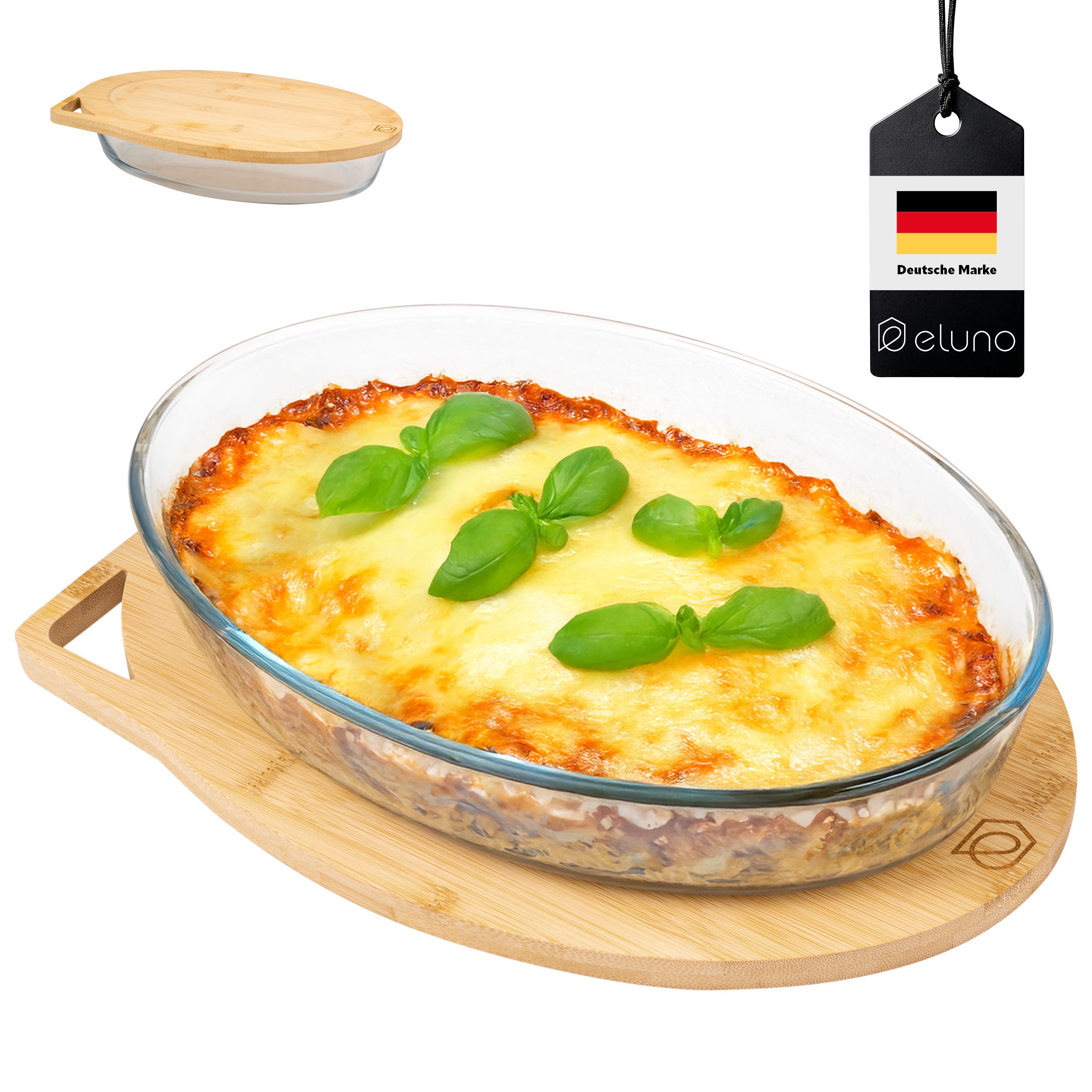 Die Vorteile auf einen Blick: * vielseitig einsetzbar * Auflaufform aus Borosilikatglas * temperaturbeständig von -20°C bis ca. 400°C * Schale spülmaschinenbeständig * Deckel aus Bambus * plastikfrei * Schale ca. 35 x 6 x 24,5 cm (B/H/T) * Deckel ca. 37 x 1,5 x 26 cm (B/H/T)