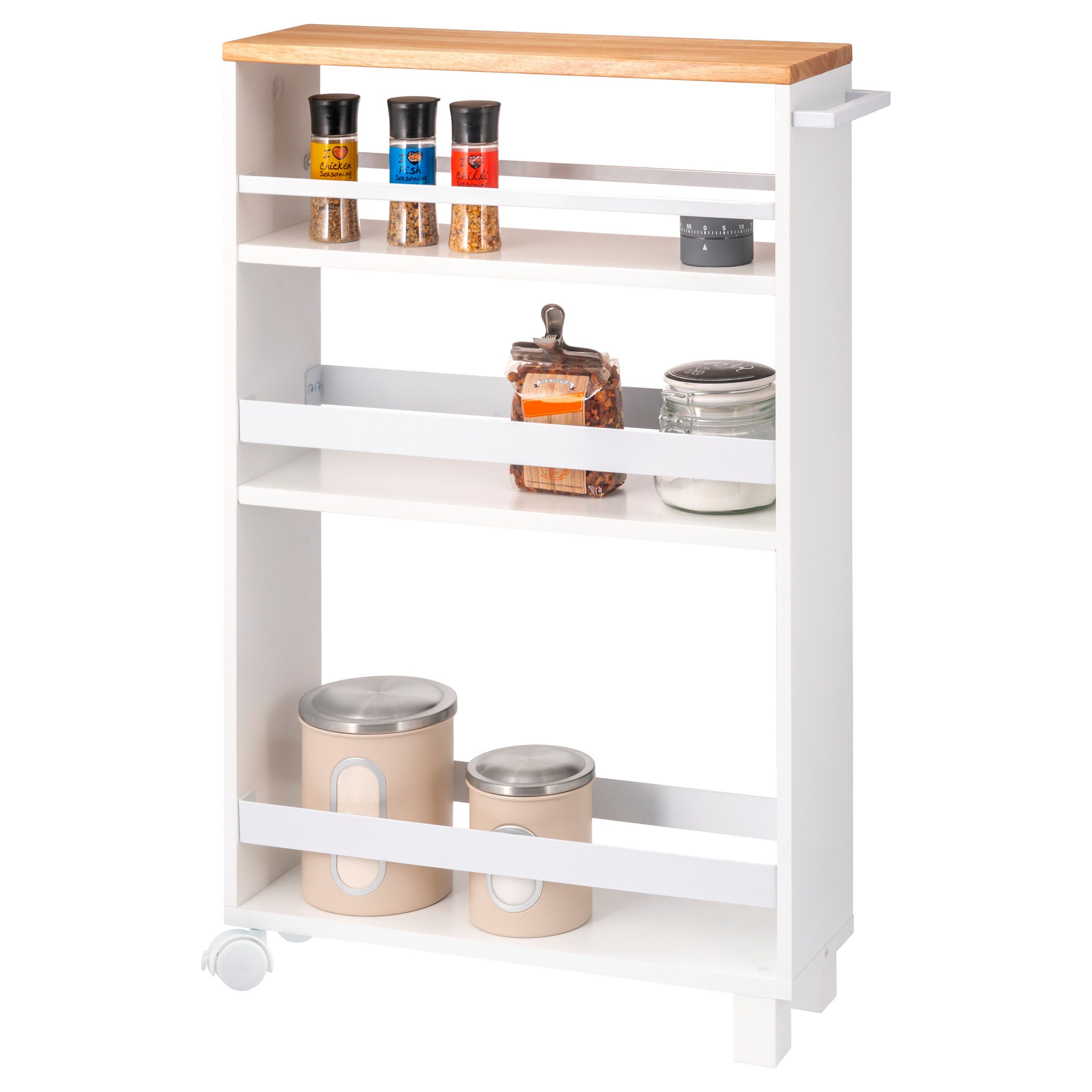 Ich habe diesen Nischenwagen in der Küche zwischen Wand und Spülmaschine (unter der Arbeitsplatte) im Einsatz. Er passt von der Optik her gut in die weiße Hochglanz Küche und dient wie ein kleiner Apothekenschrank. Rollfüße erleichtern die Bedienung.