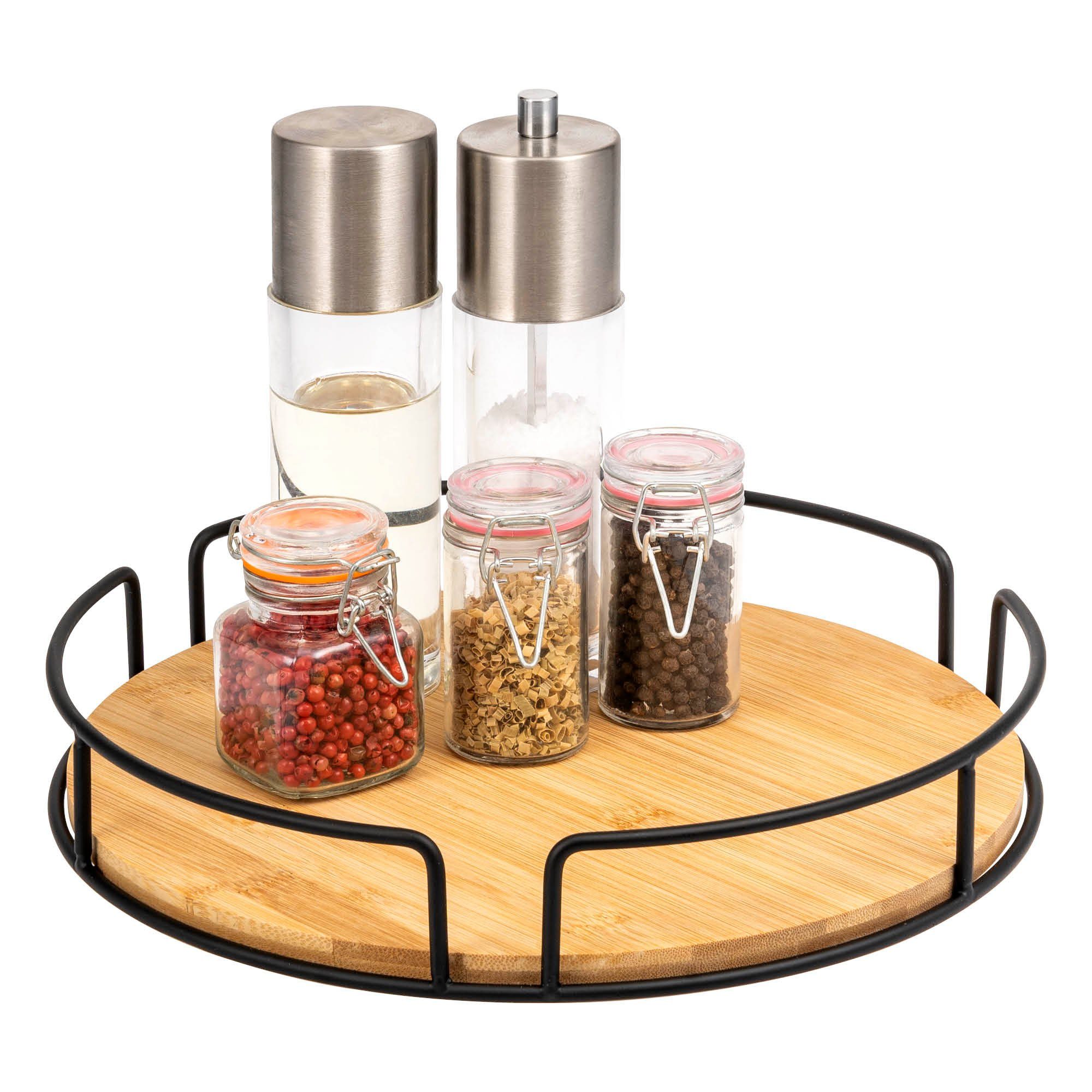 Die Vorteile auf einen Blick: ? 360° Zugriff ? mehr Übersicht ? weniger Suchen ? multifunktional einsetzbar für Küche, Büro, Hobby, Wohnzimmer ? mit rutschhemmenden Pads ausgestattet ? Material: Metall, matt schwarz lackiert ? Bambus ? Abmessung von ca. Ø 30 cm x 6 cm Höhe ? Bambusteller ca. Ø 29 cm x 1 cm