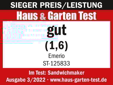 Das Magazin „Haus & Garten Test“ testet den Emerio ST-125833 im Vergleich mit insgesamt drei Sandwichmakern. Die „gute“ Funktion überzeugt u. a. mit einer gleichmäßigen Bräunung und schnellem Aufheizen. Die Handhabung ist einfach: Z. B. ist das Gerät bedienfreundlich und leicht zu reinigen. Es ist „gut“ verarbeitet. Außerdem punktet der niedrige Energieverbrauch. Mit dem Gesamtergebnis „gut (1,6)“ erreicht das Gerät im Test Platz zwei und ist der „SIEGER PREIS/LEISTUNG“.