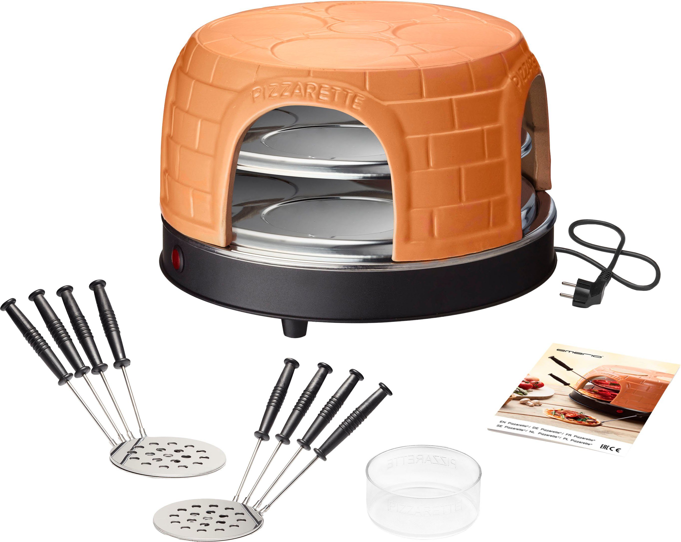 Впередe Vorteile | 8 Personen gleichzeitig: Mit diesem Modell können bis zu 8 Personen gleichzeitig eine Pizza zubereiten. Durch die handgemachte Terracotta Ton-Haube wird Feuchtigkeit aufgenommen und es entsteht eine wunderbar knusprige Pizza. Dank der oberen und unteren Heizelemente wird die Pizza von unten knusprig und oben verläuft der Käse wunderbar. Ein absoluter Hit zum Kindergeburtstag, Partyabend mit Freunden oder besinnlich mit der Familie. Kinder lieben diese Aktivität und lernen selber zu kombinieren. Dabei ist es auch noch gesund und es bleibt Ihnen der unangenehme Geruch von zum Beispiel Fondue oder Raclette erspart. Kurze Zubereitungszeit: Je nach Belag ist die Mini-Pizza in 5-7 Minuten fertig gebacken, der Teig sollte dünn ausgerollt sein. Pre-Bake Technologie: Diese Pizzarette verfügt auf der Oberseite der Kuppel über passende Mulden, um den Pizzateig vorzubacken. Eine intelligente Technologie sorgt dafür, dass die Hitze im Inneren des Gerätes bleibt. |