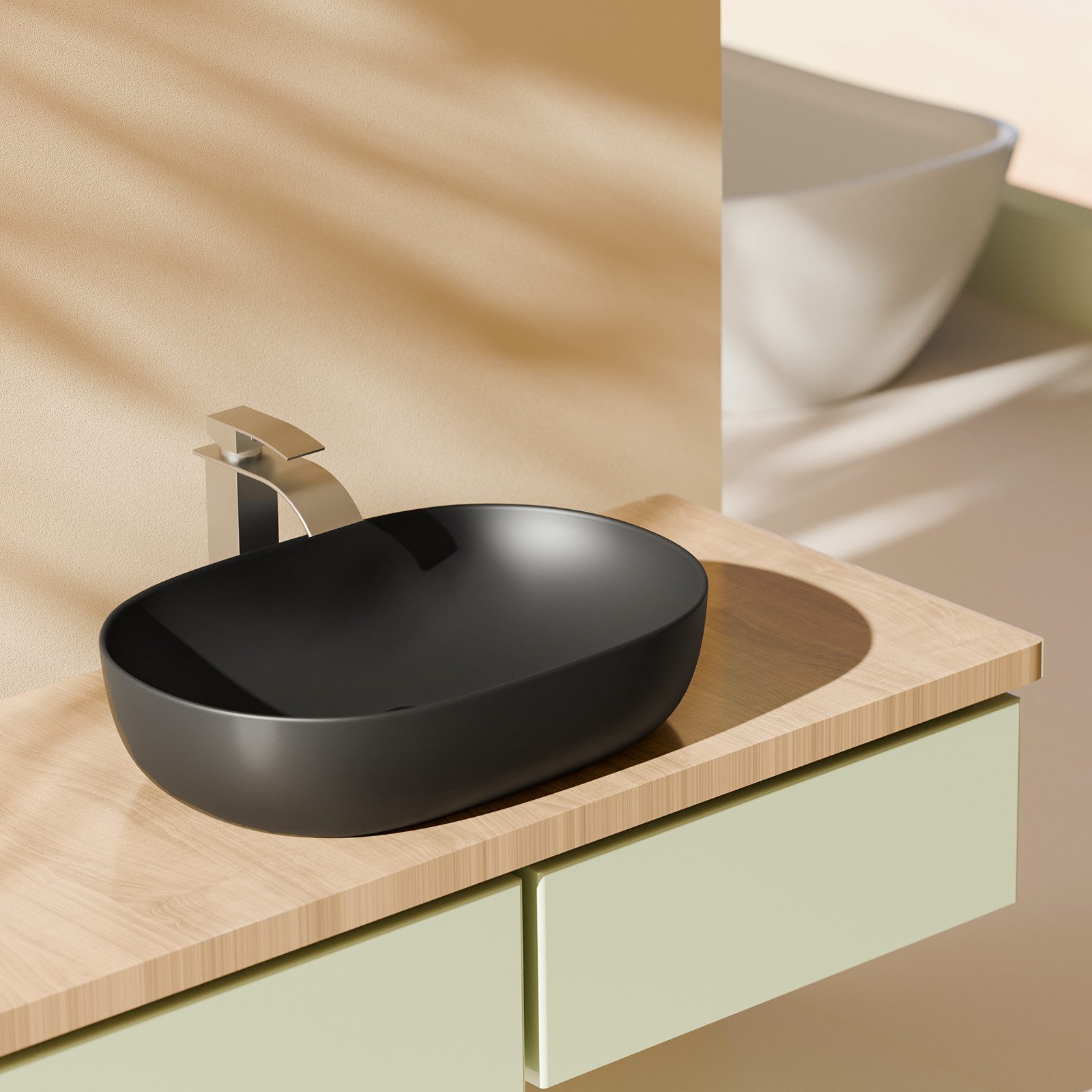 Design & Form: Elegantes, ovales Aufsatzwaschbecken mit sanften Rundungen für eine zeitlose Badgestaltung und harmonische Optik.