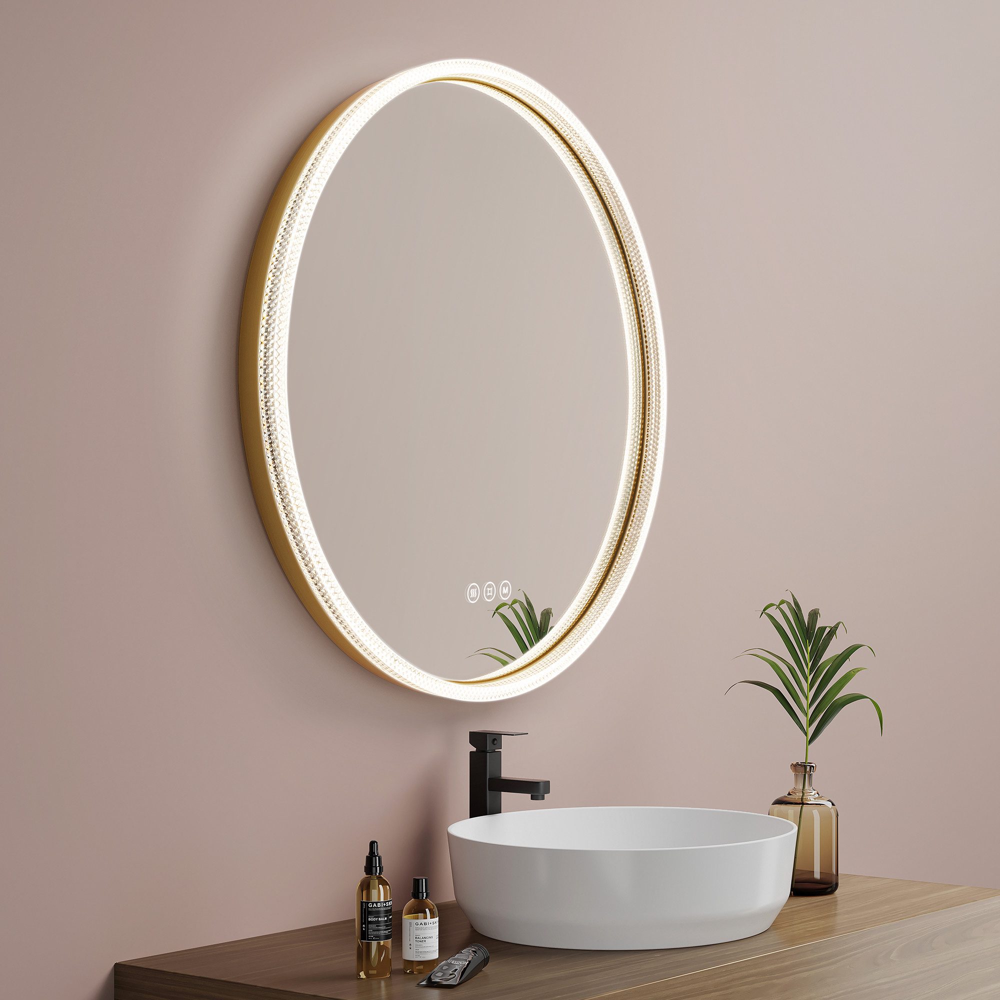 Verwandeln Sie Ihr Badezimmer in einen Ort der Eleganz mit dem "Crystal Glow" LED-Badspiegel. Dieser runde Spiegel kombiniert modernes Design mit luxuriöser Ästhetik und fortschrittlicher Technologie. Der Rahmen aus hochwertigem Aluminium ist in tiefem Schwarz oder edlem Champagner-Gold erhältlich und wird durch einen kristallähnlichen Acryl-Rand ergänzt, der bei jeder Beleuchtung ein funkelndes Lichtspiel erzeugt – ein echter Blickfang, der an die Schönheit eines geschliffenen Juwels erinnert.