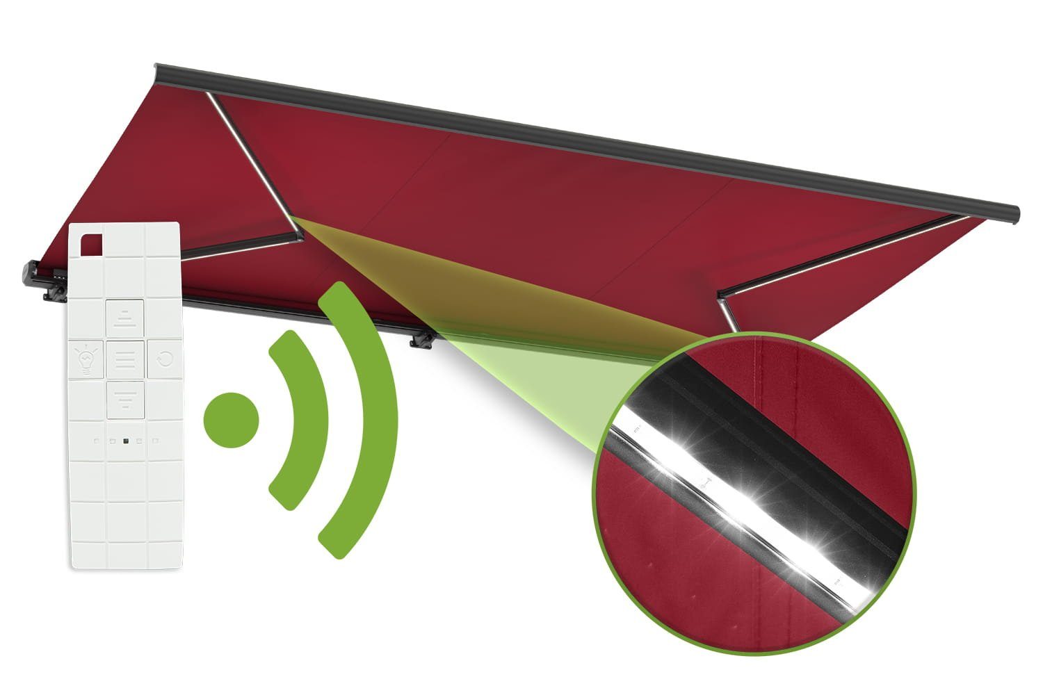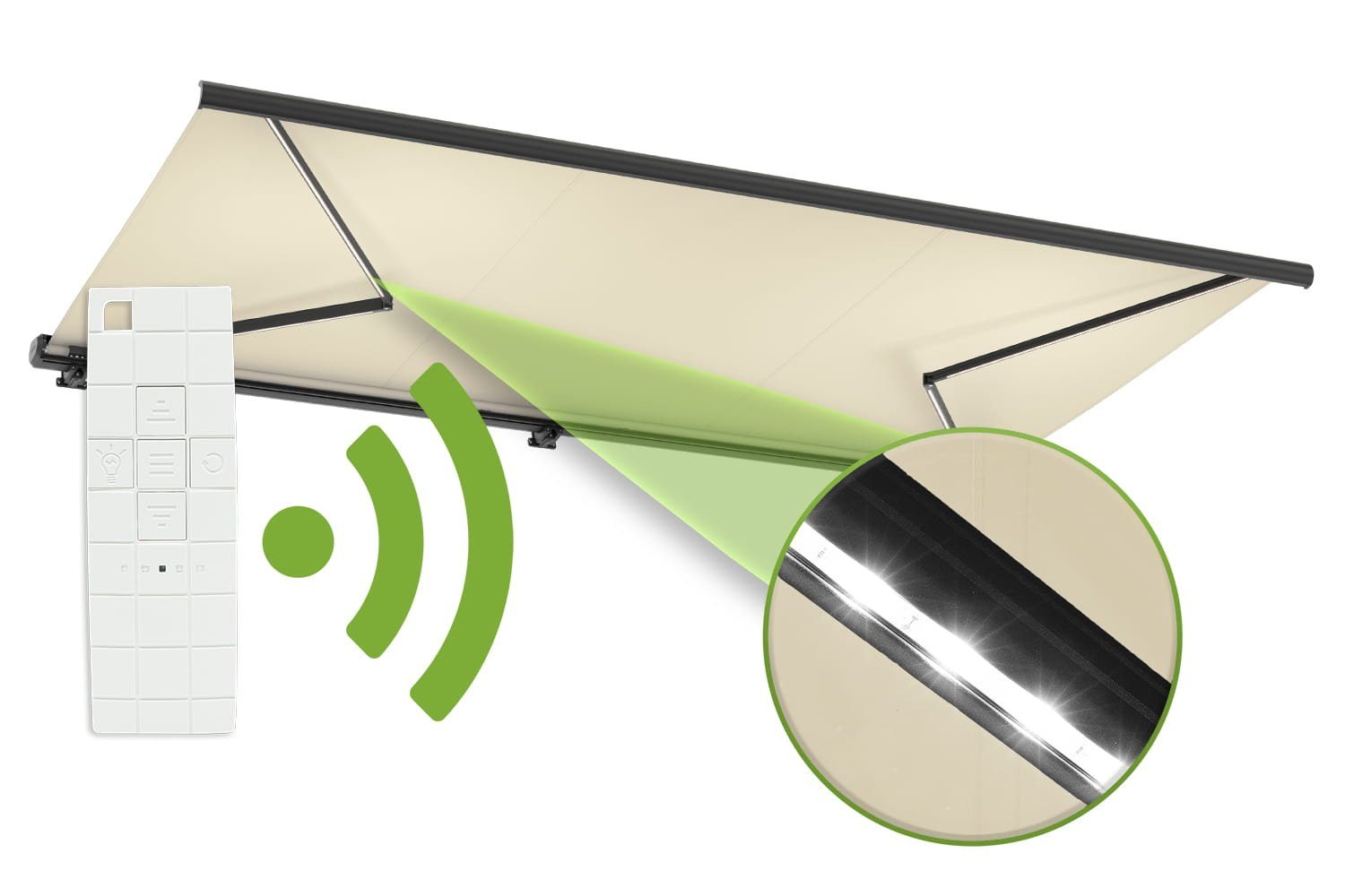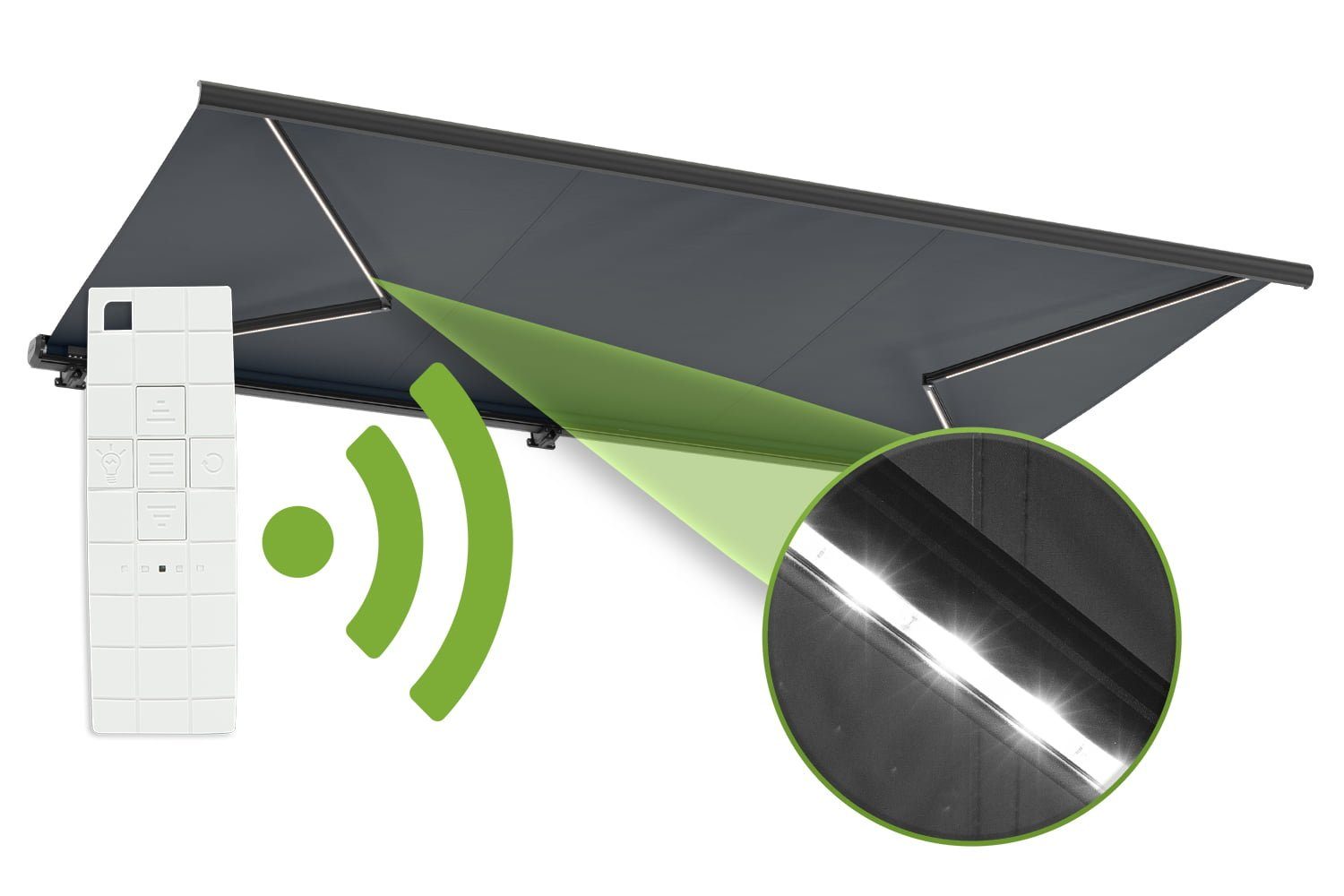 Die empasa Vollkassettenmarkise „PROFI“ mit LED-Beleuchtung sorgt nicht nur für Schatten, sondern auch für ein gemütliches Beisammensein bei Einbruch der Dunkelheit.