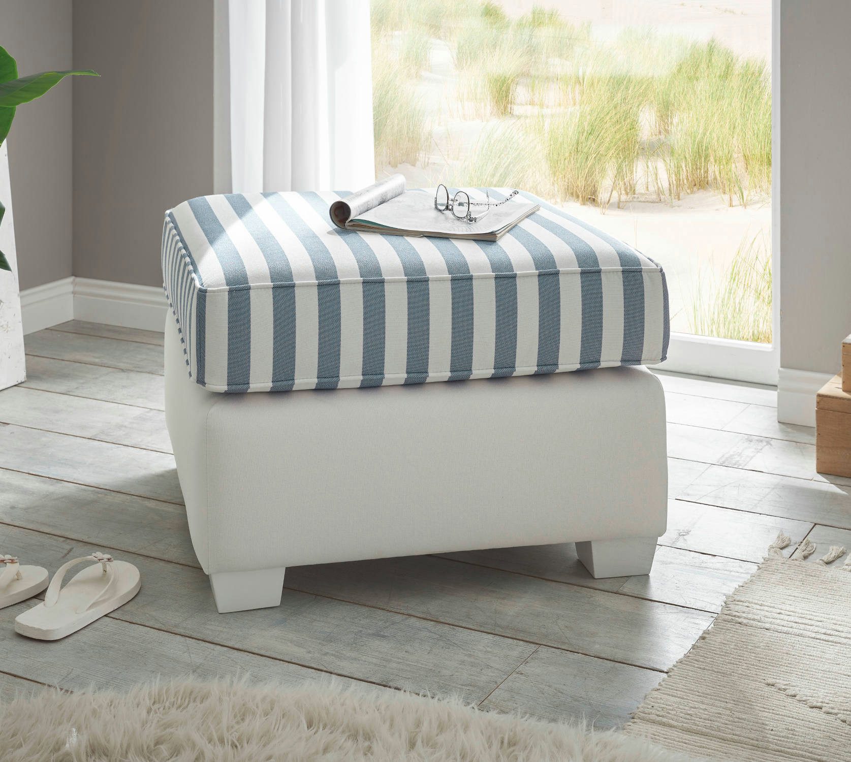 Der Polsterhocker Wales von Empinio24 verkörpert den maritimen Landhausstil mit seinem gestreiften Bezug in Blau und Weiß. Der bequeme Hocker besticht durch seinen hochwertigen Federkern mit Wellenunterfederung für langanhaltenden Sitzkomfort.
