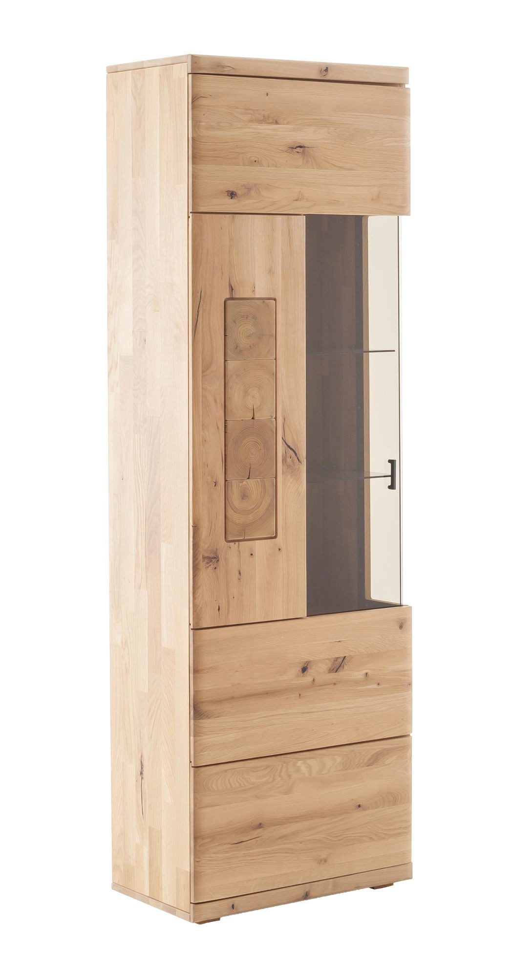 Der Vitrinenschrank aus dem Programm Palencia kombiniert auf elegante Weise Funktionalität und zeitloses Design. Mit einer Breite von 65 cm und einer Höhe von 203 cm bietet er hinter einer Tür mit seitlichem Glaseinsatz aus braun abgedunkeltem Sicherheitsglas eine stilvolle Möglichkeit, Geschirr, Gläser oder Dekorationsobjekte zu präsentieren. Die Fronten aus massivem, geöltem Balkeneichenholz mit durchgehender Lamelle und dekorativen Hirnholz-Applikationen verleihen dem Möbelstück einen natürlichen und hochwertigen Charakter.