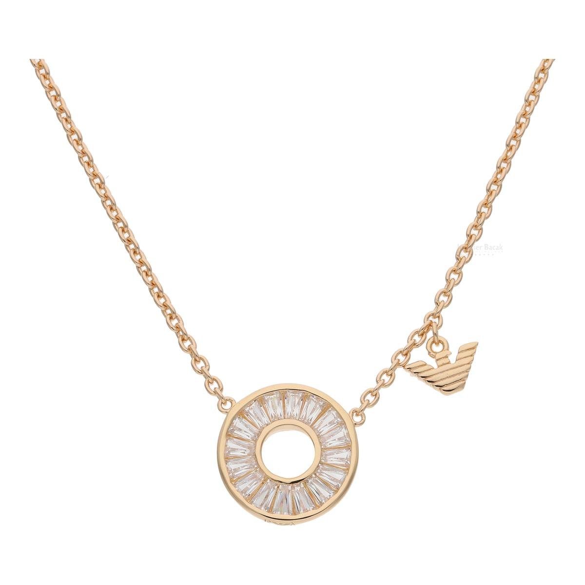 Die moderne Emporio Armani Halskette ist aus Roségold plattierten 925er Sterling Silber hergestellt und kann bedenkenlos sowohl täglich als auch zu jedem Anlass getragen werden. Der Kettenanhänger ist mit funkelnden synthetischen Zirkonia Steine besetzt, welche ein echter Hingucker sind.