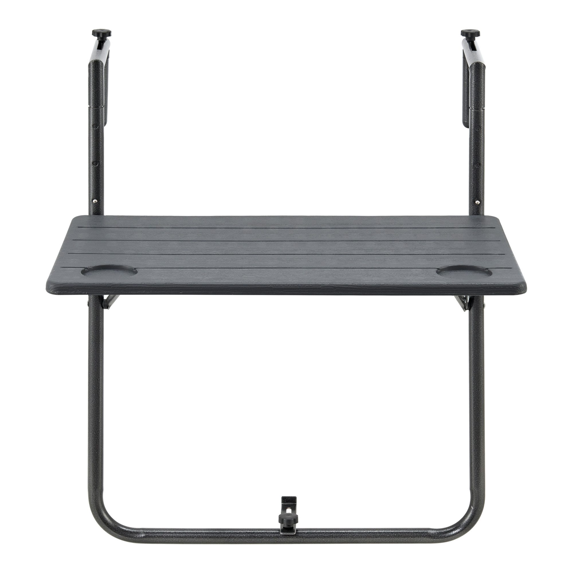 Ergänzende Maßangaben | Einstellbare Höhen: 73cm / 78.5cm / 83.5cm, Geklappt (HxBxT): 73 x 60 x 4.5 cm, Tischplatte (BxT): 60 x 36 cm, Tischplattendicke: 1.6 cm, Getränkehalter (Ø): 7 cm, Geeignete Geländerbreite: 6 - 15 cm |