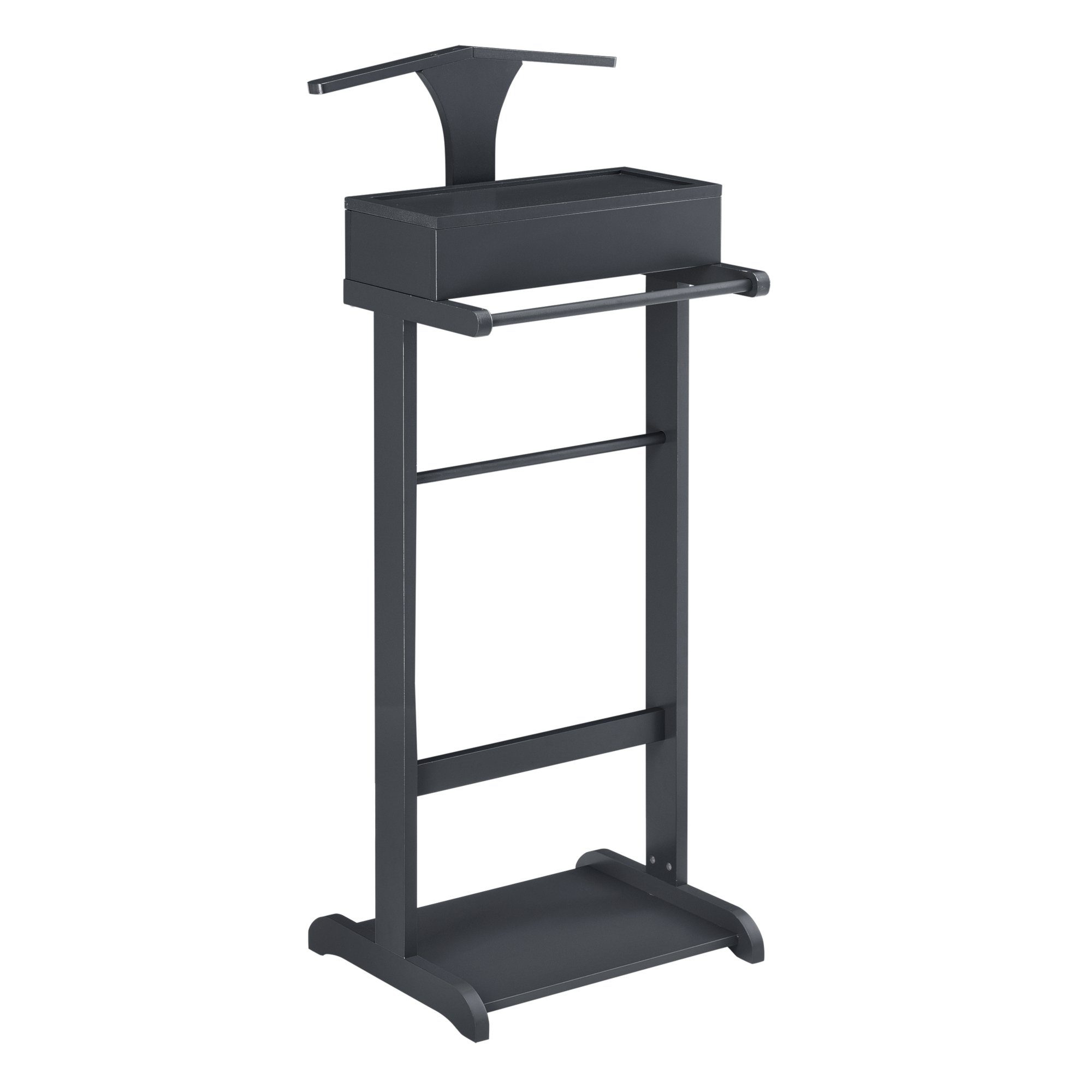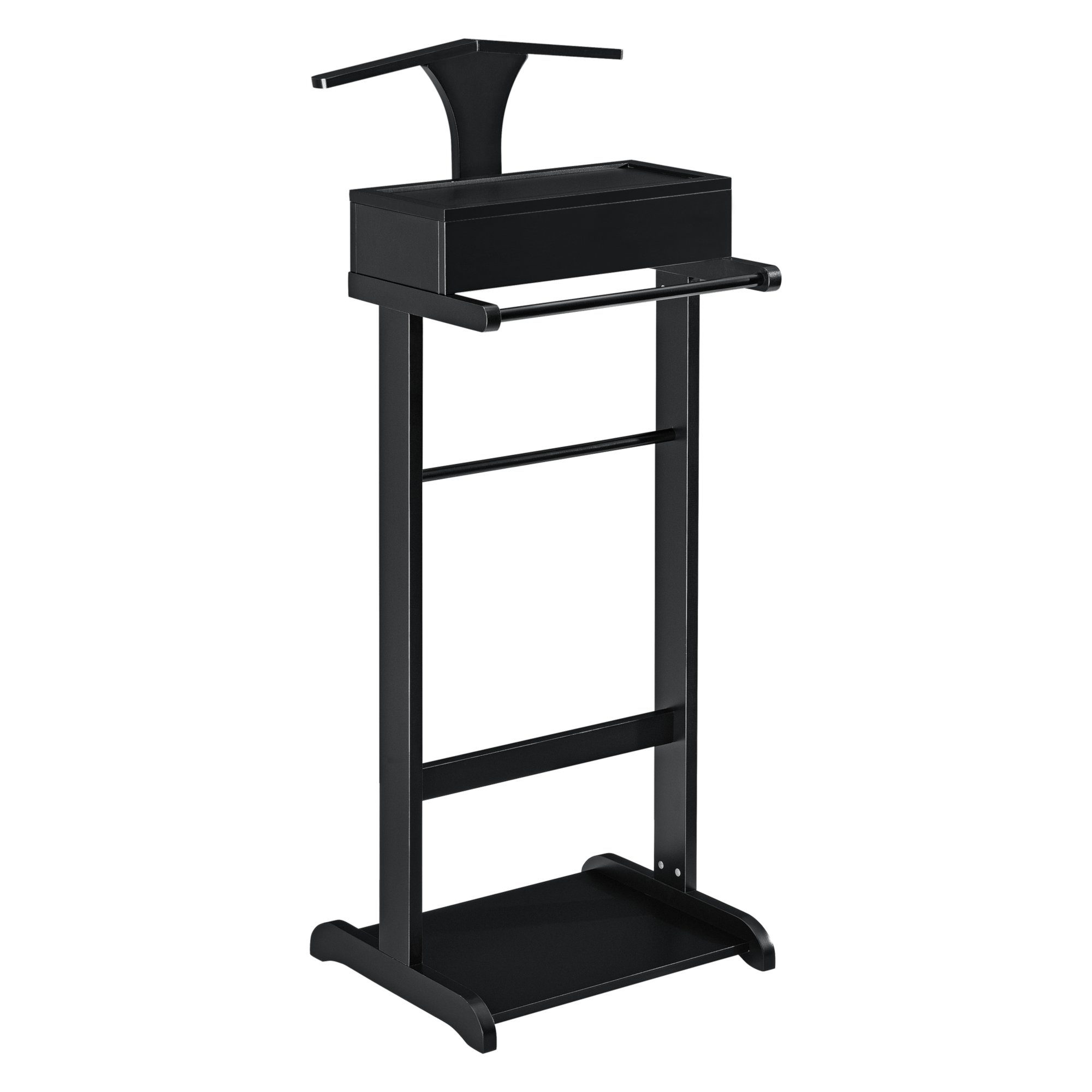 Der stilvolle Kleiderständer verfügt neben einem Kleiderbügel und einem Hosenhalter auch über ein praktisches Aufbewahrungsfach für bspw. Uhren, Armbänder oder Manschettenknöpfe.