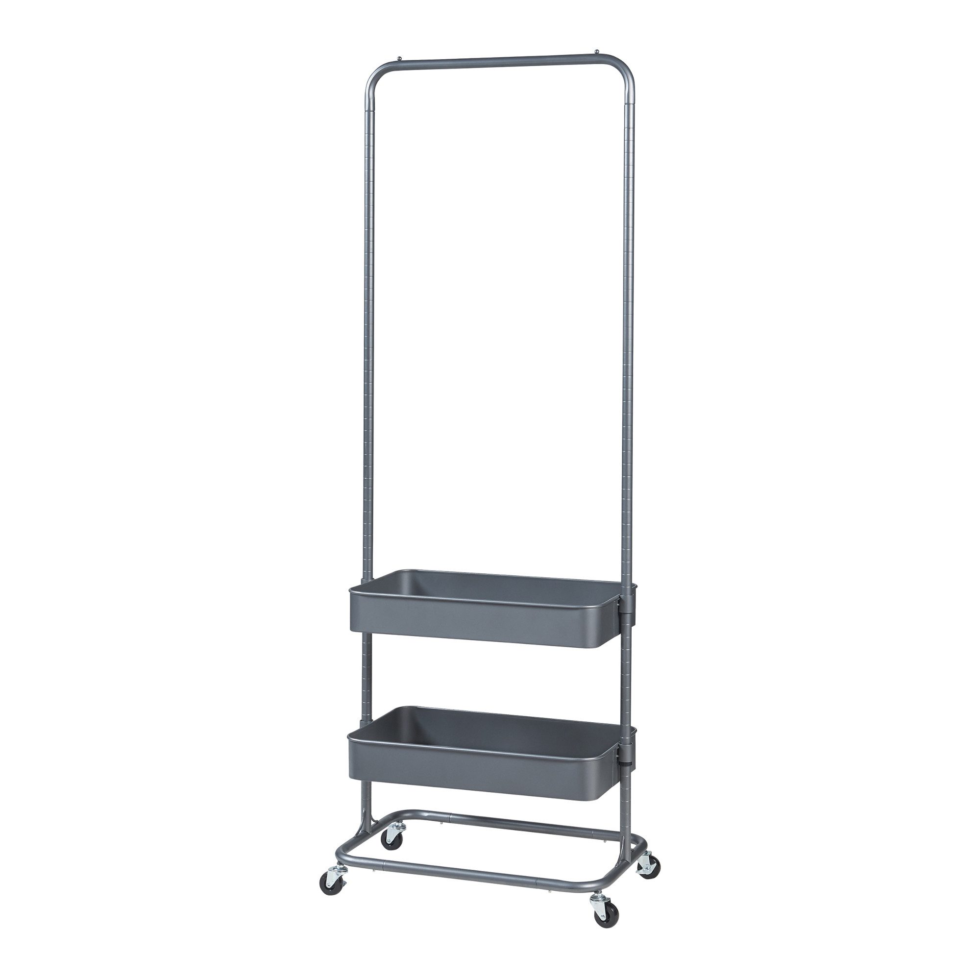 Der praktische und rollbare Kleiderständer lässt sich schnell und einfach aufbauen. Er verfügt über eine Garderobenstange und zwei höhenverstellbare Gitterkörbe.